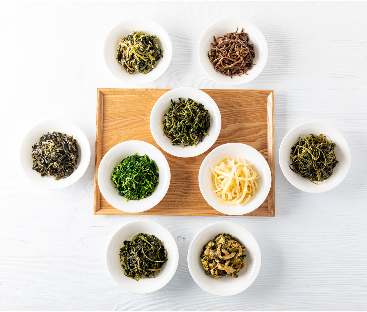 In our table, where rice is the staple, namul is a food source that adds abundant dietary fiber, vitamins, minerals, and phytochemicals. Wild vegetables, such as bracken and ixeris dentata, change our body into an alkalescent constitution. They are rich in components that strengthen the body's antioxidant power and immunity.