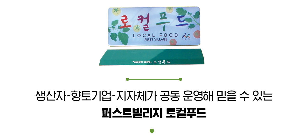 퍼스트빌리지 로컬푸드는 2016년 3월에 충청권 최대규모의 아웃도어빌리지 공간에 단독으로 설립된 로컬푸드직매장이다. 아산시 향토기업인 ㈜퍼스트빌리지와 생산 농업인, 아산시가 서로 협력해 설립한 직매장으로 지역 농산물의 가치를 높이고, 지역경제 활성화에 기여하고 있다. 특히 로컬푸드를 이용한 식당을 함께 운영하며 생산자의 소득을 보장하고 소비자들에게는 건강한 제철 음식과 휴식공간을 제공해 크게 인기를 끌고 있다.