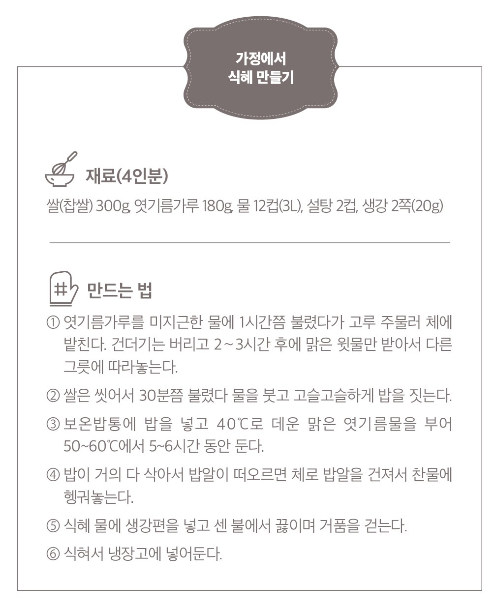 시중에서 파는 일반적인 식혜는 효소제와 설탕 등을 넣어 다소 쉽게 단맛을 냅니다. 그렇게 만든 단맛은 전통 식혜의 깊은 맛이 나지 않죠. 이것이 나쁜 것은 아닙니다. 대량 생산을 위해서는 어쩔 수 없는 선택일 것입니다.