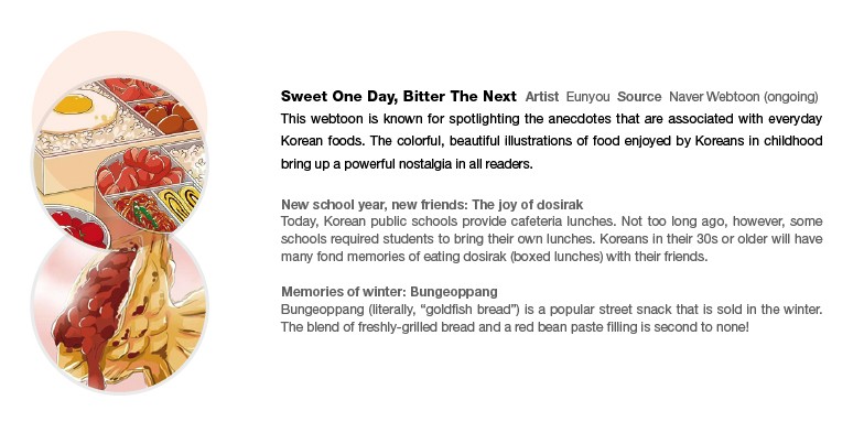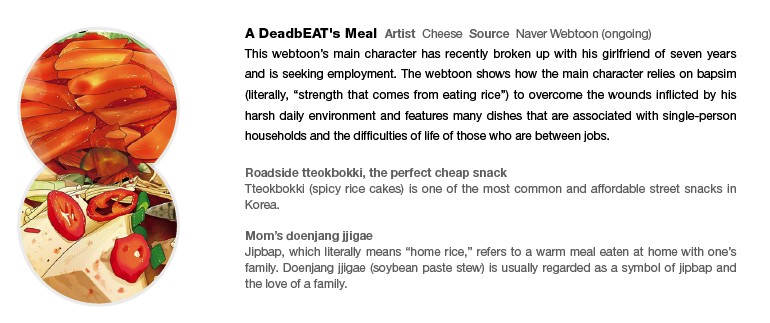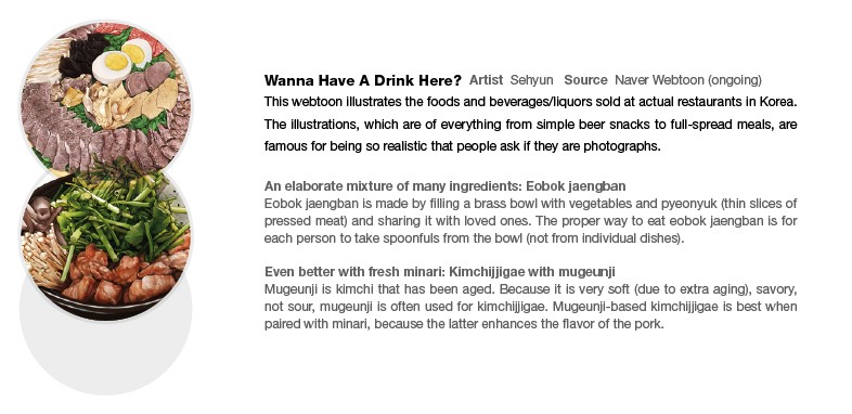 The word bapsim (literally, “strength of rice”) refers to the importance of having an adequate meal in order to perform everyday tasks. The taking of meals is a deeply-rooted priority in Korea, to the point that people greet one another by asking whether the person has eaten. It should thus come as no surprise that a sizable portion of “K-content” (entertainment content produced in Korea) is devoted to meokbang/cookbang and miscellaneous TV programs on food. This month, we found examples of Korean foods appearing in webtoons, a genre of Hallyu content that is quickly gaining ground, that are pleasing in both appearance and taste.