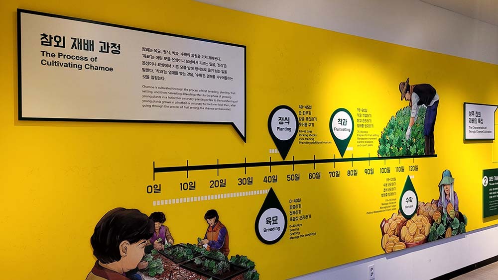 이처럼 성주가 국내 최대의 참외 생산지가 된 까닭을 알기 쉽게 설명하고, 세계적인 특산물이 된 참외를 테마로 꾸민 놀이 공간이 ‘성주참외 체험형 테마공원’이다. 시원하게 뿜어져 나오는 분수대를 앞에 두고 있는 ‘참외랑 아이랑’ 체험 전시관은 입구부터가 범상치 않다. 참외를 깎아 잘라 놓은 모양의 통로를 지나면 정면에 참외를 재배하는 모습의 모형이 꾸며져 있다. 그 좌측으로는 참외의 기원과 역사, 성주 참외 재배 과정과 방법, 특징 등 성주가 왜 참외에 적합한 환경을 갖추고 있는지 쉽게 이해할 수 있도록 정리되어 있다.