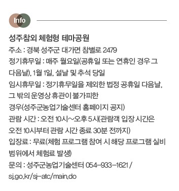 중부내륙고속도로 성주IC를 빠져나오면 곧 지붕 위에 큰 참외 모형이 올려져 있는 건물이 눈에 들어온다. 성주군농업기술센터와 함께 운영되고 있는 ‘성주참외 체험형 테마공원’은 참외의 본고장인 성주군이 참외의 기원과 역사, 참외 재배 농기구, 참외로 만든 음식 및 자료 등을 전시 소개하고, 365일 참외 향기가 솔솔 나는 체험학습을 목적으로 건립되었다.