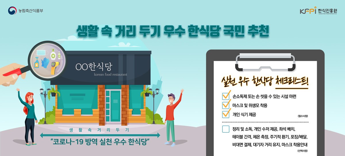 Upon conversion from ‘Social distancing’ to ‘Distancing in life’, Ministry of Agriculture, Food and Rural Affairs and Korean Food Promotion Institute will implement <Recommendation of excellent restaurants for distancing in life> and <Establishment and dissemination of standard models of Korean restaurants for distancing in life>.