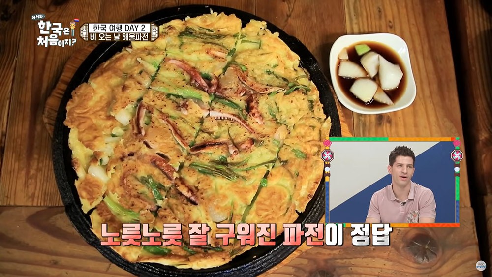 The perfect companion for any jeon is, of course, makgeolli. Many of the featured tourists are unfamiliar with makgeolli, as it is not as well-publicized outside of Korea compared to soju. It is often described as “Korean wine” or “rice wine” because of the difficulty in translating the brewing process into English. Another aspect of makgeolli that foreigners are interested in, other than the novelty of it, is the custom of keeping it in an (often, dented) golden nickel-silver kettle and drinking it from a receptacle that looks like a Korean soup bowl or even a hat! The fun involved in drinking makgeolli can potentially segue into an interest in the liquor’s association with Korea’s modern history.
