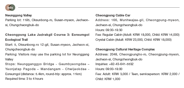 Course 3 of Cheongpung Lake Jadrakgil (set of walking trails similar to Jeju-do’s Ollegil), called “Eoreumgol Ecological Trail,” passes through the Neunggang Valley area for those who wish to experience the ice valley and is also known for the fresh air supplied by the stream. Unfortunately, the storied beauty of the stream’s surrounding area (also called “Neunggang Gugok” for having nine picturesque landscapes (with gu meaning “nine” in Korean)) is long gone due to the submerging of Cheongpung-myeon after the construction of Chungju Dam. The only surviving landscape is the upper part of the stream.