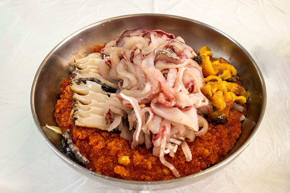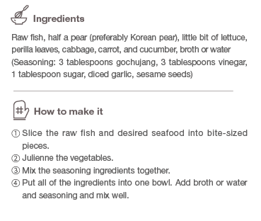 Mulhoe, a dish made by mixing sashimi with a spicy seasoning, is slightly different in each region of Korea depending on the time of year and the seafood that is caught in that area. In the eastern coastal areas, a major summertime catch is squid, which has resulted in Gangwon-do becoming the home of delicious squid mulhoe.