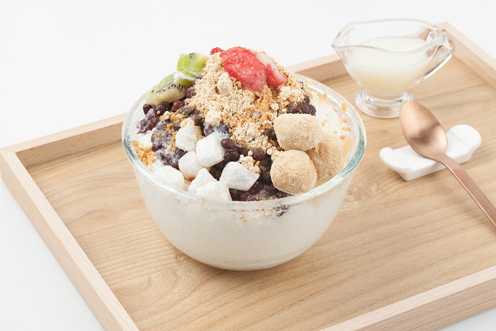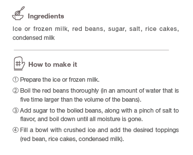 Bingsu is a famous Korean summer delicacy that is made by piling up shredded ice and topping it with multiple ingredients. It is often called patbingsu (with “pat” meaning “red bean.” Bingsu is made in diverse ways around the world: in Korea, the classical version is made by topping shredded ice with boiled-down sweetened red beans, rice cakes, and misutgaru (roasted grain powder). The fun of bingsu is that you can create a vast range of flavors through variations in the toppings.