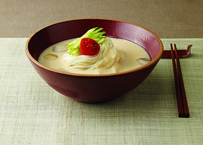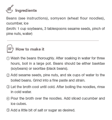 A broth made by grinding soybeans and then catching the dregs in a strainer is often eaten in the summer with a side of noodles. Most Korean noodle dishes are served warm: the exception is kongguksu, which is often served in a cold soybean broth with several ice cubes floating in it. Soybeans are rich in not only protein but also saponin, which helps prevent aging of the body and brain.