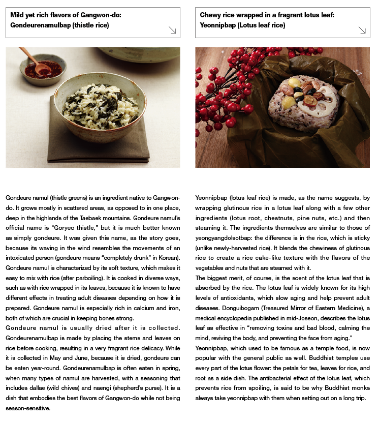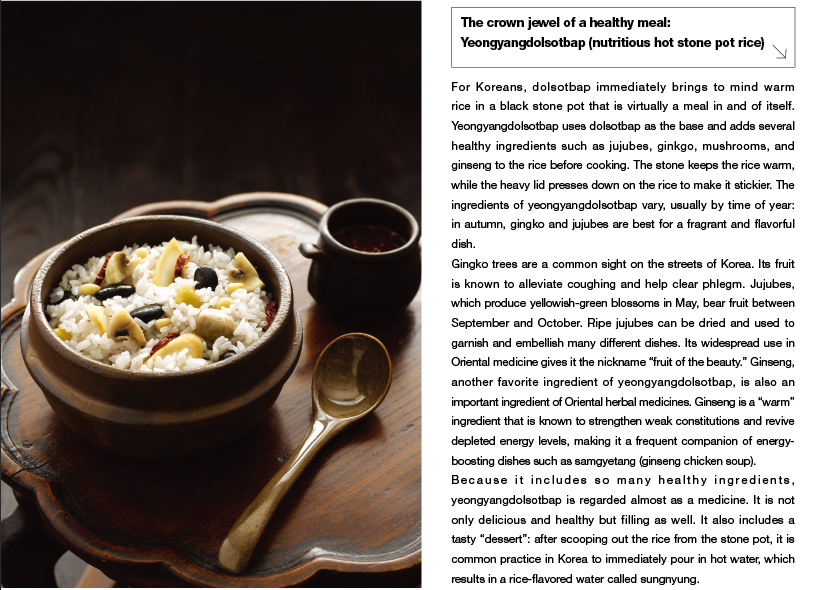 Side dishes differ by meal, but one thing has remained a core part of every meal over millennia: rice. The Korean faithfulness to rice is unique, even among other rice-eating countries. Indeed, it is common for someone who has eaten noodles with every meal on a given day to say that they feel “like something is lacking” because they did not have any rice. It is thus no surprise that Koreans are profoundly appreciative of the unique merits of rice that are not found in wheat. Rice cooked with seasonal ingredients is often served at high-end restaurants. Instead of plain rice, how about ordering a mixed version next time?