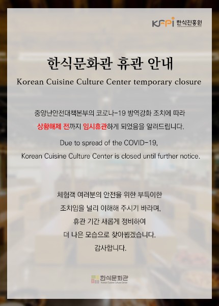 한식문화관은 방역 강화 조치 상황 해제 전까지 임시 휴관할 예정이며, 이후 재개관 관련해서는 정부 지침에 따를 예정이다.