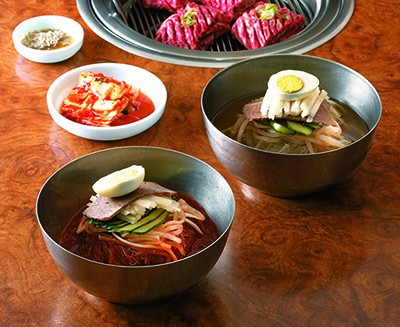 냉면은 말 그대로 차가운 면을 이용한 요리다. 메밀을 이용해 만든 반죽을 가늘게 뽑아내 삶았다가 찬물에 담가 식힌다. 여기에 살얼음이 언 차가운 육수를 붓거나, 고춧가루 등을 이용해 만든 빨간 양념장을 얹는다. 물냉면과 비빔냉면 완성이다. 냉면은 차갑다는 속성 때문인지 고기를 다 먹어갈 때쯤 마무리로 곁들이는 것이 보통인데, 차가운 냉면 한입에 뜨겁게 구운 고기를 함께 올려 먹는 경우도 많다. 그 맛이야 말해 뭣하랴.