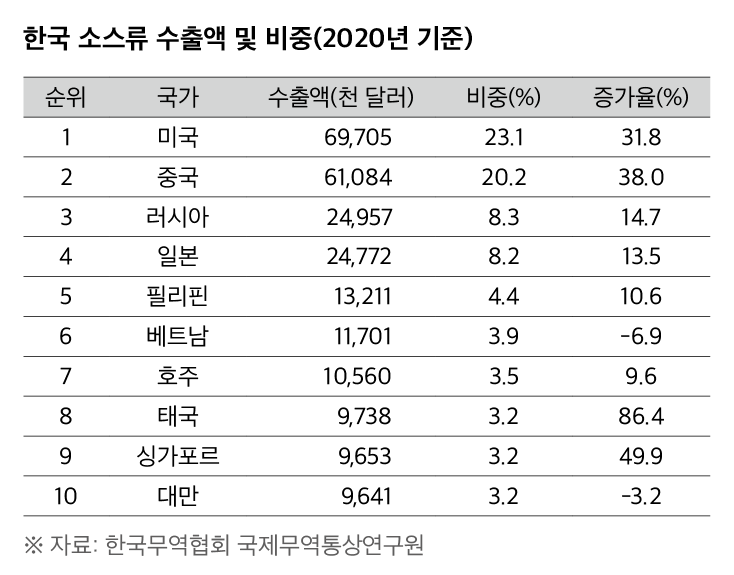 이처럼 우리의 전통장류를 기반으로 한 한식 소스들은 해외 시장에서 좋은 반응을 얻고 있다. 한국무역협회 국제무역통상연구원의 발표에 따르면 2020년 소스류 수출이 전년 대비 25.8% 증가한 3억 달러를 돌파하며 역대 최고치를 찍었다. 2017년 수출 증가율이 12.7%, 2018년 10%, 2019년 11.9%임을 감안하면 갈수록 증가하는 셈이다. 특히 떡볶이 소스, 치킨 양념 등을 포함한 기타 소스류 및 고추장의 비중이 각각 55.5%, 16.9%를 차지하고 있다.