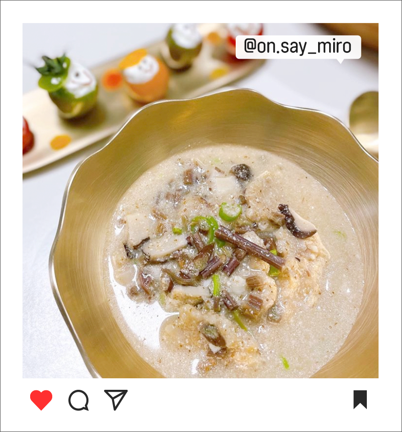 5 stems of dried bracken, 25g lotus roots, 15g whole wheat flour, 2 tbsp perilla seed powder, ½ tsp minced garlic, 2 tbsp minced green onion, perilla oil, ½ golden oak mushroom, and 250ml water or vegetable stock
