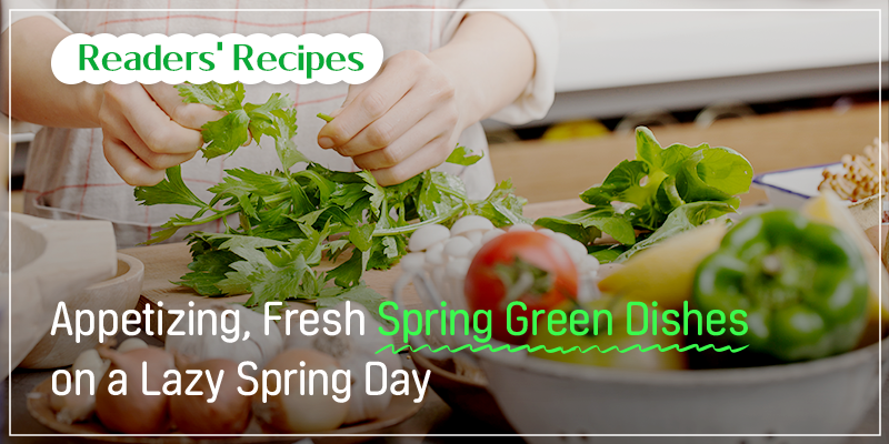 Spring vegetables with their own unique charms bring color to the table while stimulating our appetite. The simple addition of several ingredients to nutritionally-rich spring greens completes healthy foods that are light but keep you full. This May issue features three refreshing spring green recipes prepared and recommended by our readers.