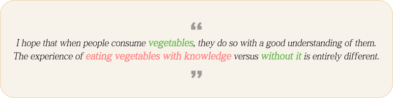 "There were many culinary schools, but not many that focused on food ingredients. For ingredients, all you had to do was visit a supermarket, but I wanted to know how they were produced. During my research, I discovered a profession called 'vegetable sommelier' in Japan. I thought it would be wonderful if we had such a job in Korea. Sometime later, I learned that a course had been introduced in Korea. In 2009, I became the first graduate of that course."