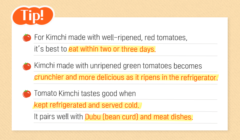 Koreans know that most food ingredients can be used to make Kimchi. Indeed, there are hard-to-understand Kimchi dishes, but tomato Kimchi is loved due to its unique charm. You might question if Kimchi can be made with tomatoes. But, the moment when you take a bite of it you will fall for its charm!