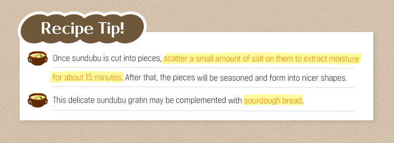 You can get creative when it comes to gratin, as can use any ingredients you like in a gratin dish. Why not try sundubu (soft bean curd)? Sundubu's moist and watery texture will add a unique flavor to your gratin. Once you taste sundubu gratin that delightfully melts in your mouth, we bet you will be fascinated by it.