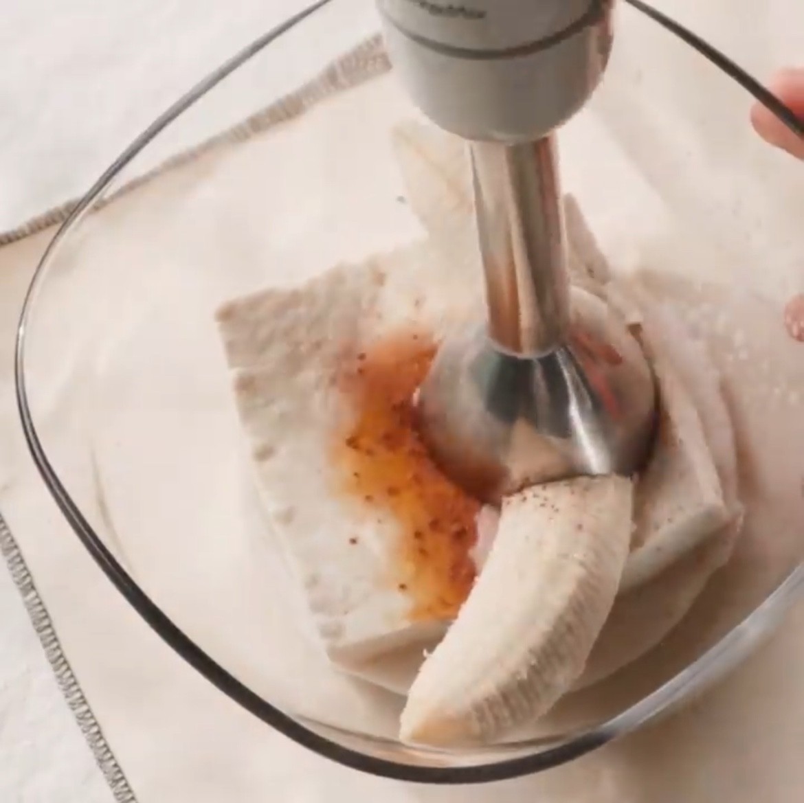 ① Finely grate bean curd, 1/2 banana, soy milk, honey, and cinnamon powder in a bowl.