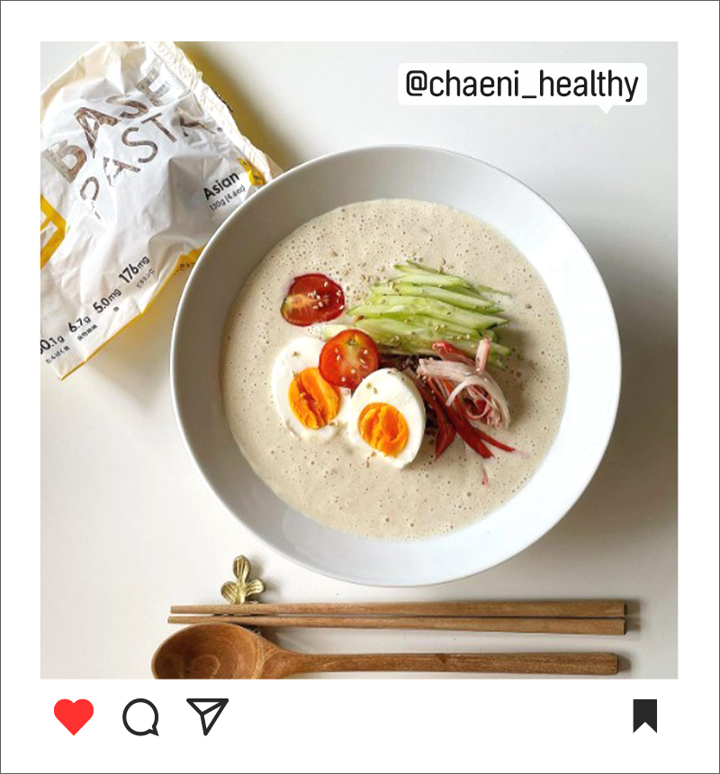 ④ Put the noodles, boiled egg, tomato and cucumber pieces into soybean-based soup and then top it with any garnish you want.