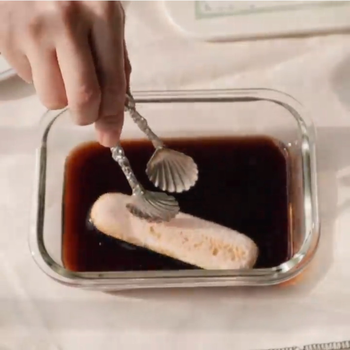 ② Soak ladyfinger biscuits (or castella) in espresso.
