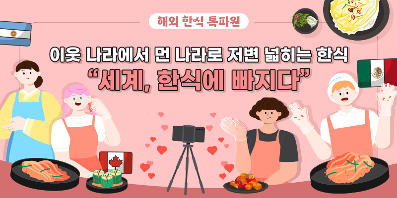 한류의 시작은 가까운 아시아 시장이었다. 아시아 시장에서 K팝과 드라마의 인기로 시작한 한류는 점점 한국 음식으로, 그리고 문화로 빠르게 확대됐다. 이제는 일시적인 트렌드가 아닌 하나의 문화로 자리잡은 한류는 인근 국가들부터 대륙을 건너 아르헨티나, 멕시코, 쿠웨이트와 같은 나라들에까지 영향력을 미치고 있다. '4차 한류 열풍'이라는 말이 나올 정도로 이웃 나라에서 먼 나라로 그 저변을 넓히고 있는 한식 이야기를 살펴보자.