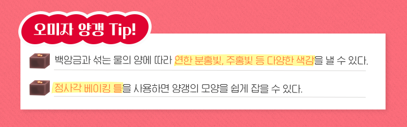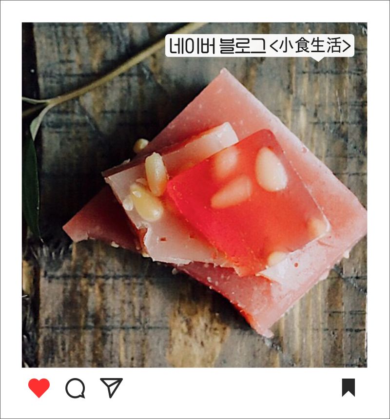 오미자청과 한천, 백앙금 등 자연재료를 활용해 만든 오미자 양갱은 분홍빛의 고운 색감만큼 맛도 좋다. 과실청을 사용해 은은하고 달달한 맛을 부담없이 즐길 수 있고, 매실청 등 다른 과실청으로도 응용해 만들어볼 수 있다. 상큼한 오미자와 중간중간 씹히는 잣이 어우러져 더욱 깊은 풍미를 자아내는 오미자 양갱을 올여름 다식으로 즐겨보자.