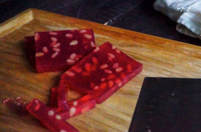 궁중에서 즐겼던 다과의 일종인 과편은 다양한 제철 과일을 응용해 만든 한국식 젤리다. 과편에는 주로 앵두, 살구, 오미자 등 고운 색감을 낼 수 있는 과일들이 사용된다. 그중에서도 맑은 선홍색과 상큼한 맛의 오미자는 과편을 더욱 먹음직스럽게 만들어주는 재료다. 한 조각 맛보면, 과편의 탱글탱글한 식감과 새콤한 오미자의 매력적인 조화를 느낄 수 있을 것이다.