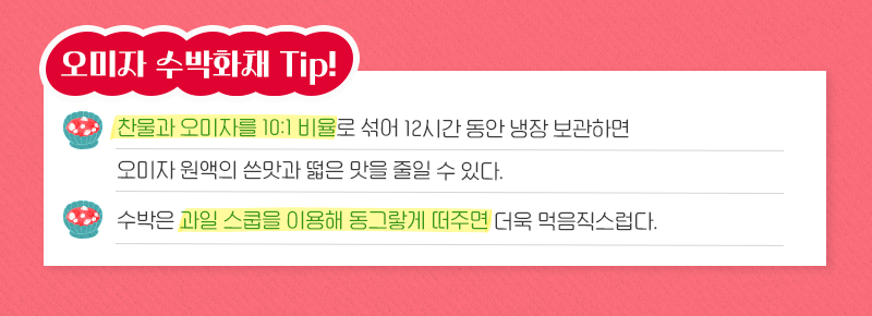 화채는 갈증을 해소하고 싶은 무더운 날 가장 먼저 생각나는 여름 간식이다. 화채가 생각 날 때 우유나 탄산음료가 아닌 오미자 원액을 꺼내보자. 오미자의 시원 새콤한 맛이 청량함을 더해줘 여름 디저트를 더욱 특별하게 즐길 수 있을 것이다.