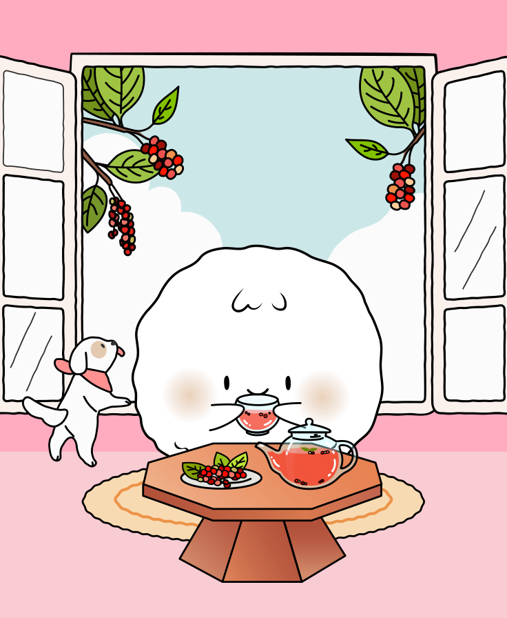 무더운 여름날, 오미자차를 마시며 더위를 식히고 있는 밥돌이의 모습을 배경화면에 담아보세요!