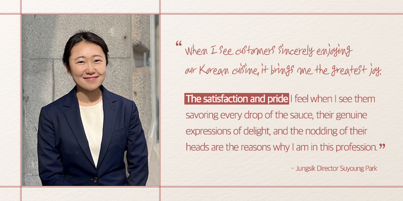 Customers visiting Jungsik have a special meaning for Director Park. The sight of customers enjoying Korean food is her driving force and nourishment. "My greatest joy is seeing customers sincerely enjoying our Korean food," said Park. "The pride and satisfaction I feel when I see them savoring every drop of the sauce, their genuine expressions of delight, and the nodding of their heads are the reasons why I am in this profession."