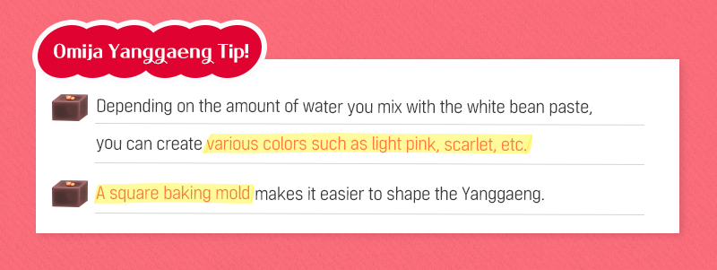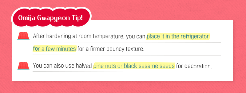 Made with natural ingredients such as omija extract, agar, and white bean paste, omija yanggaeng tastes as good as its pretty pink color. You can create the faintly sweet flavor by using fruit-based syrups such as maesilchung (green plum syrup). Enjoy omija yanggaeng with the refreshing flavor of omija and deep flavor of crunchy pine nuts as a fantastic Dasik for your tea this summer.