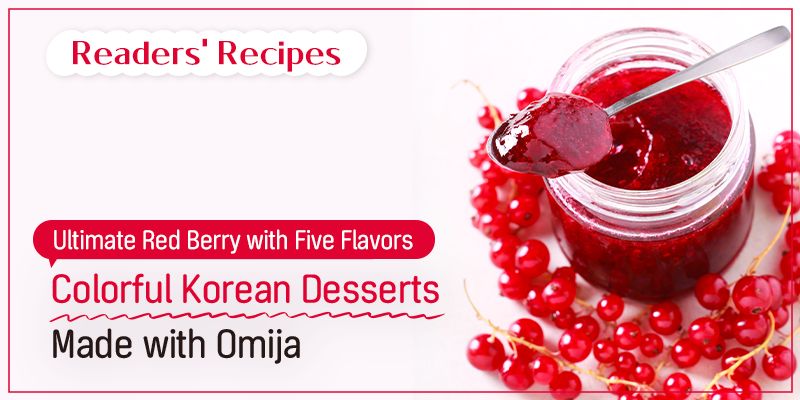 In this August issue, we introduce omija desserts that will revitalize your heat exhausted daily life. Omija, which is named for the five tastes it carries - sweet, bitter, tart salty, and spicy, displays a stronger tart flavor and a beautiful red jewel-like color, making it a popular ingredient in traditional Korean drinks and snacks. Let's meet the colorful omija desserts created by tradition with a modern twist.