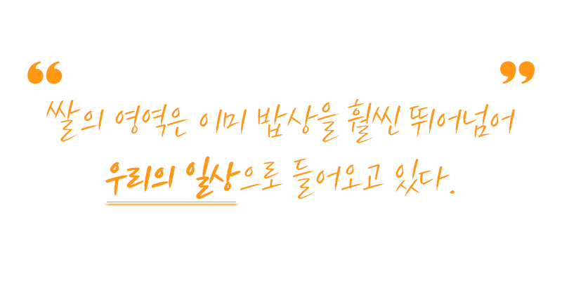 예로부터 삼시세끼 밥을 먹는 것을 중요하게 생각했던 우리에게 밥과 쌀은 너무도 익숙해 오히려 소중함을 느끼지 못했던 존재이지 않았을까. 하지만 쌀의 발랄한 변신은 이제부터 시작이다. 밥상을 넘어 더 많은 우리 일상에 찾아올 쌀의 새로운 모습이 기대된다.