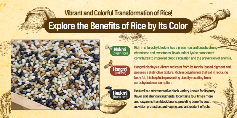 Particularly, the nutty taste of Heukmi(black rice) is good for anti-aging and immune enhancement, while Hongmi(red rice), with its vibrant red hue, is known for its excellent antioxidant properties. Nokmi(green rice) helps improve blood circulation and prevents anemia.