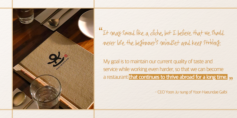 Yoon Haeundae Galbi's future goal is to build trust with customers and become a restaurant that remains in their hearts. When it comes to future goals and plans, Yoon said, "It may sound like a cliché, but I believe that we should never lose the beginner's mindset and keep striving." He added, "My goal is to maintain our current quality of taste and service while working even harder, so that we can become a restaurant that continues to thrive abroad for a long time."