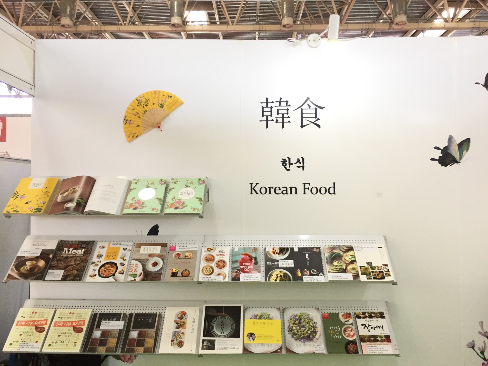 이곳에서 우리는 한류의 대표 콘텐츠인 대장금 이야기가 담긴 책자를 비롯하여 전 세계인들에게 사랑받는 한국음식인 김치·비빔밥·불고기 등의 간편한 한식 레시피를 풀어놓은 요리책 등을 16종이나 만날 수 있었습니다. 국제 도서전답게 중국어·영어 등으로 번역 된 책도 함께 전시되어 외국인들의 관심을 끌었습니다.