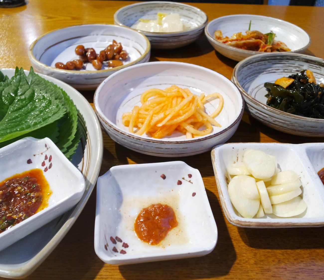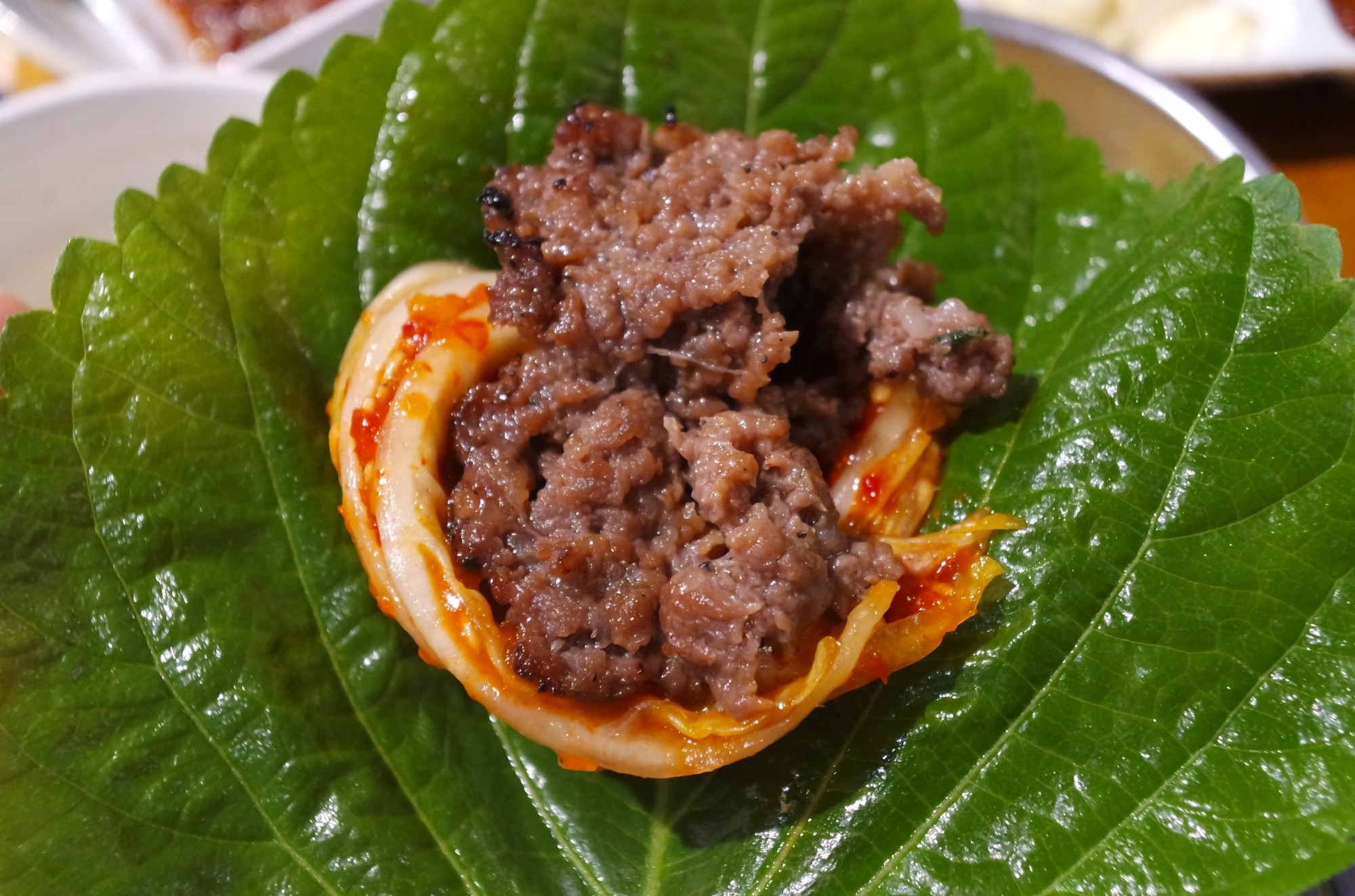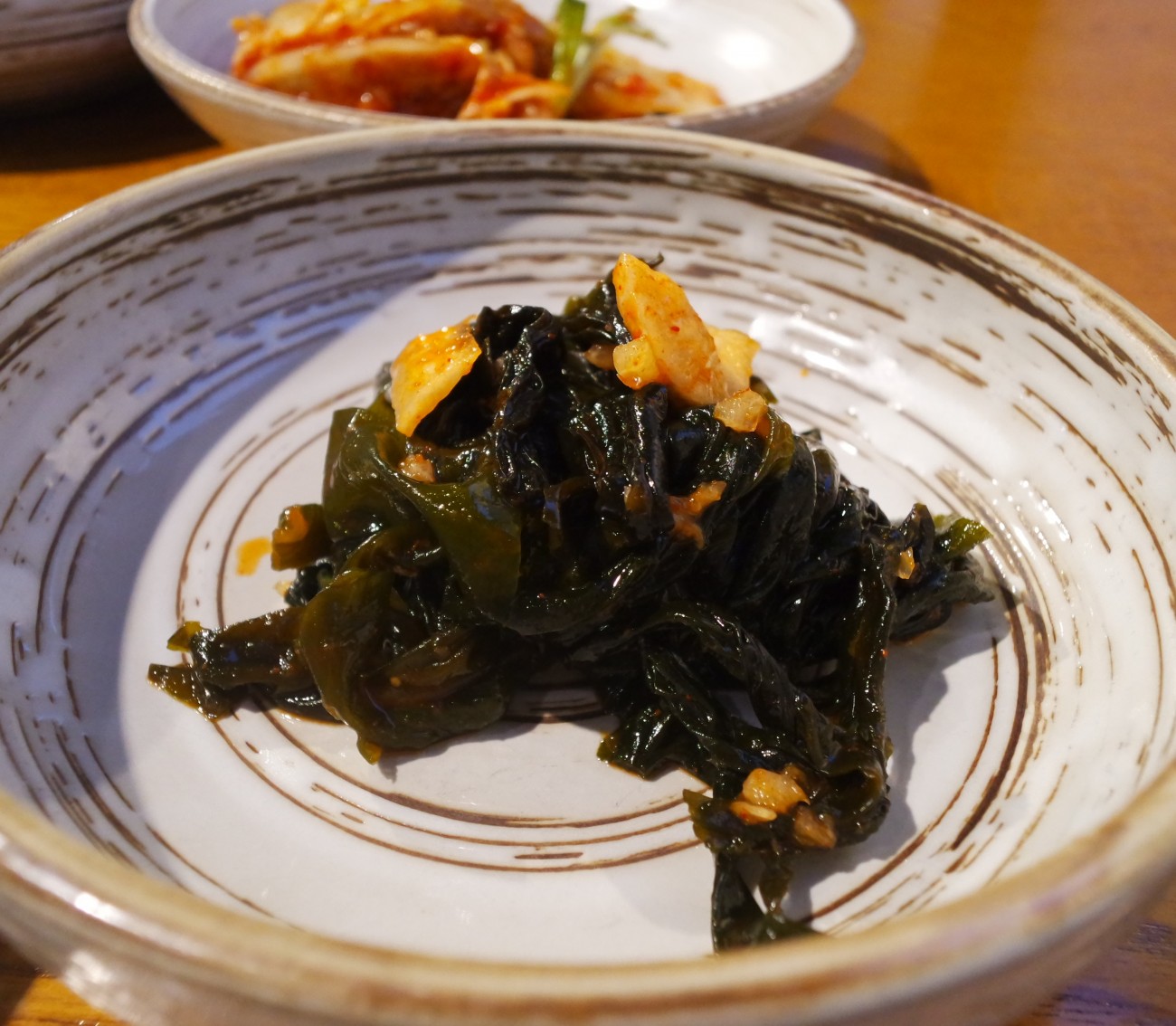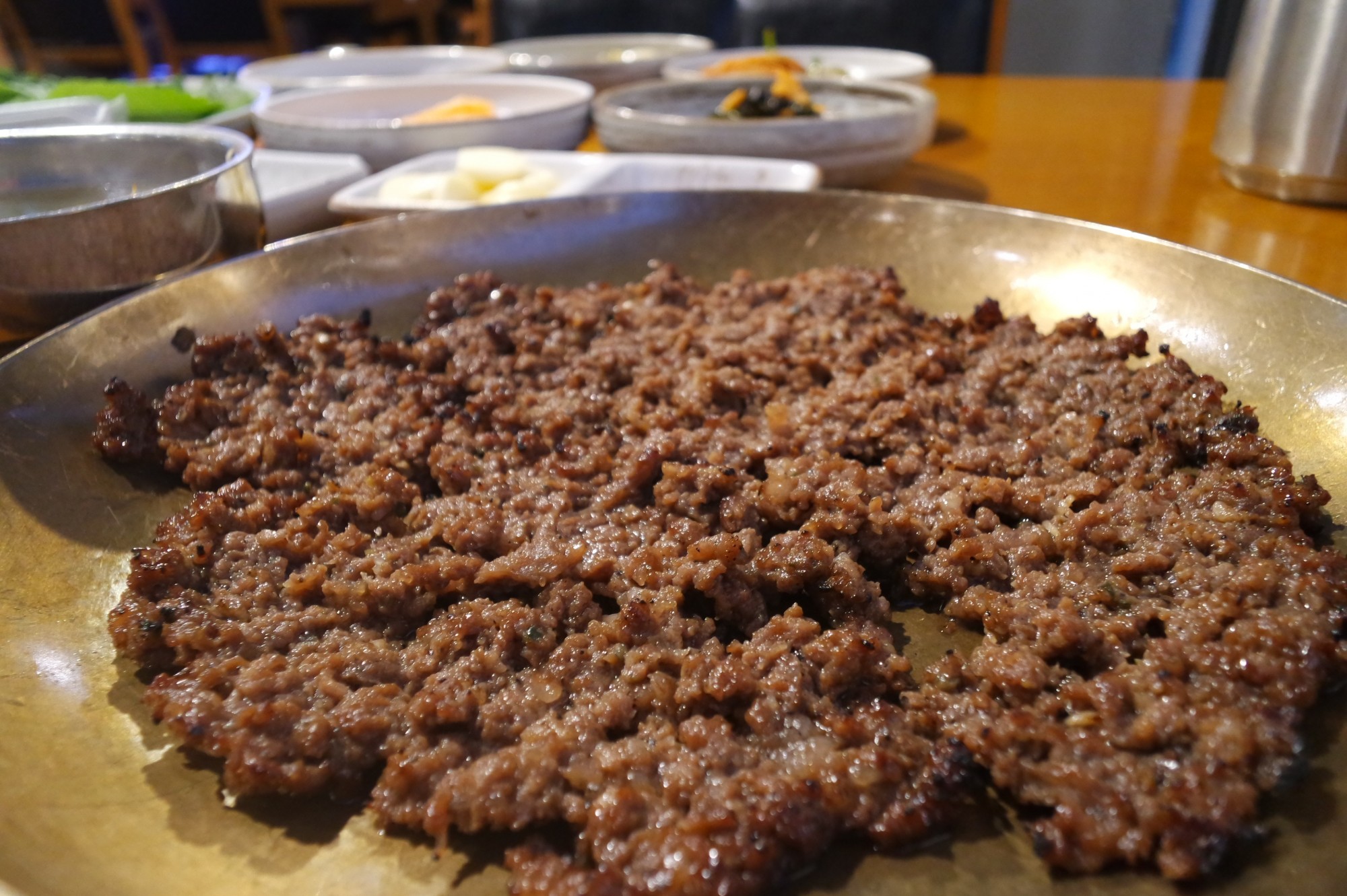 각종 밑반찬, 동치미 등과 함께 메인요리인 바싹 불고기가 등장했습니다. 불고기와 비슷한 색을 띄면서도 납작하게 붙어있는 모습이 재미있습니다. 겉은 바싹 잘 익히고, 속은 야들야들하고 부드러워서 맛과 식감이 참 좋았습니다.