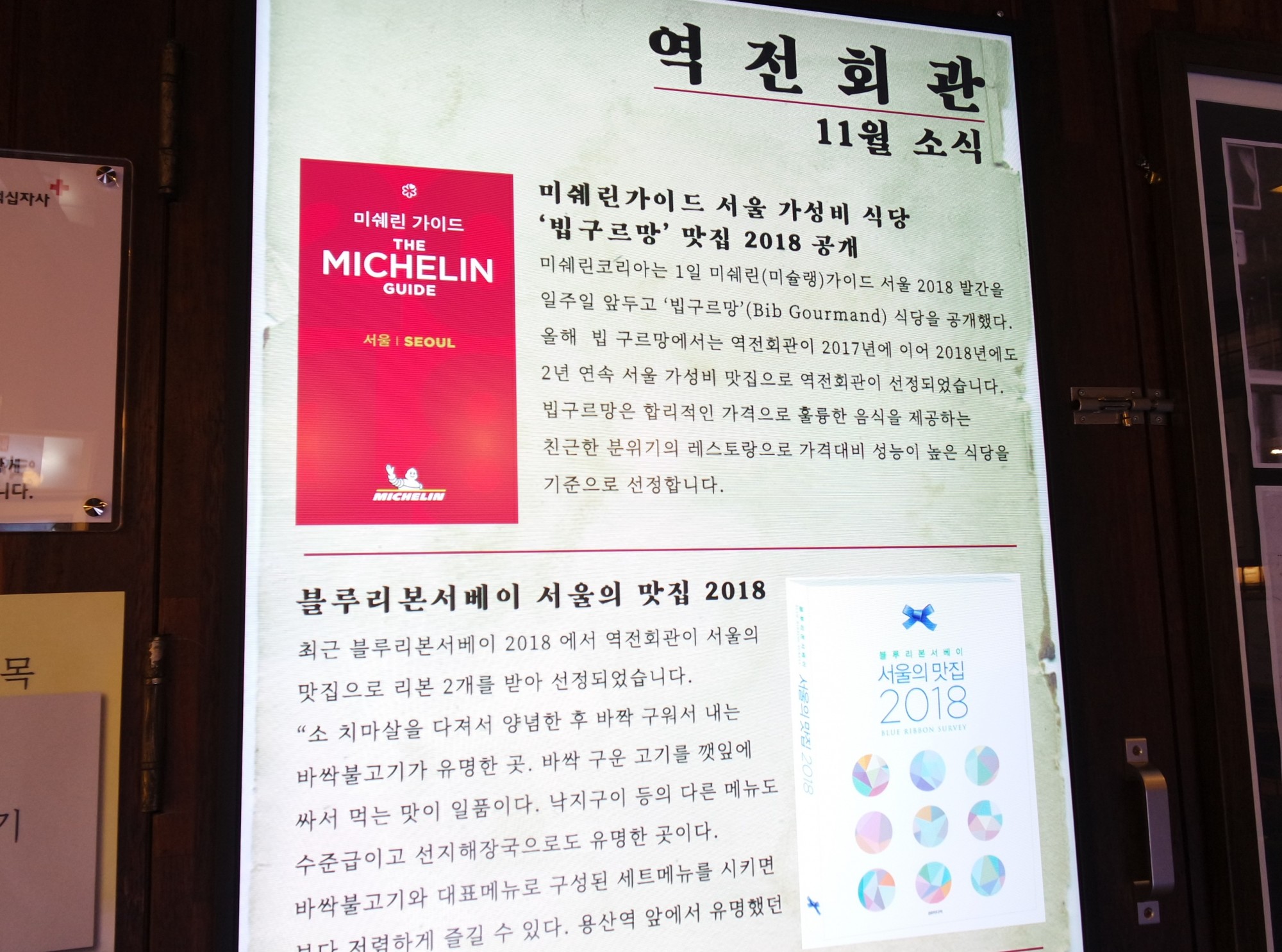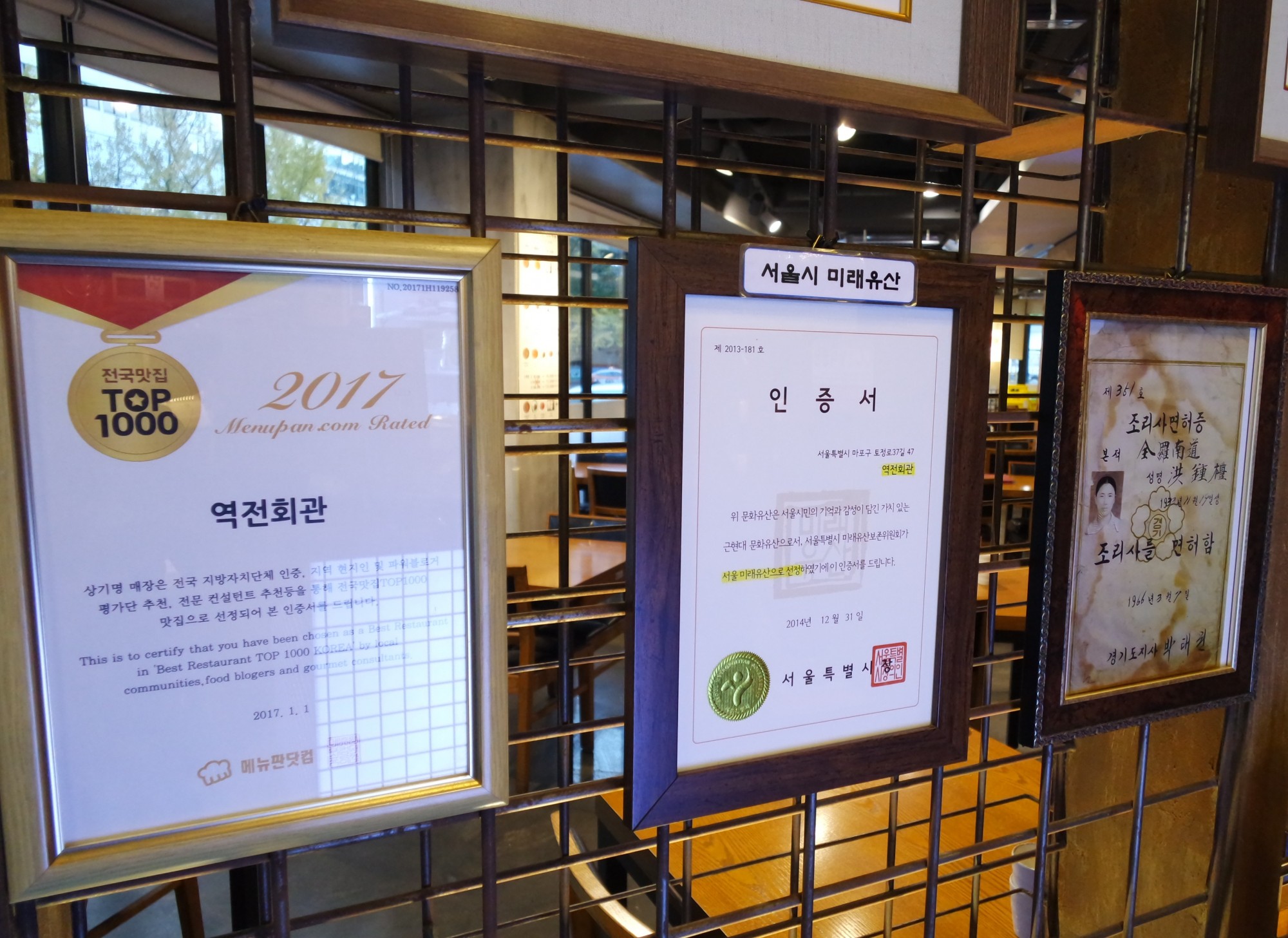 마포에서 꽤 유명한 한식당으로 알고는 있었지만 입구 내부에 진열된 각종 음식과 요리 관련 기관과 단체로 부터 수여받은 "맛집" 인증서들이 역전회관의 맛에 대한 기대감을 더욱 갖게 했습니다.