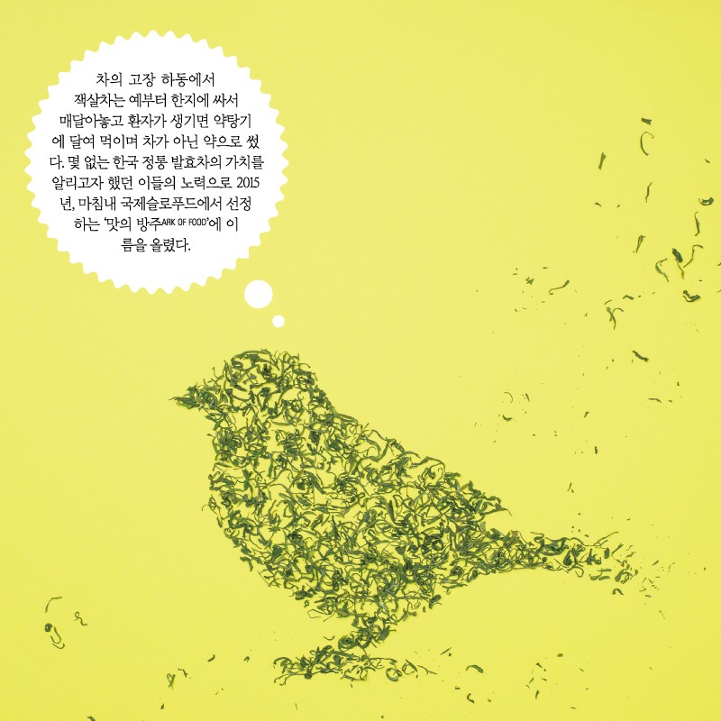 참새 작(雀), 혀 설(舌). 찻잎이 참새 혓바닥처럼 작다고 해 붙인 이름으로 경상도 방언으로 ‘잭살차’라고 한다. 고유한 식재료와 종자, 전통 음식을 보존하기 위한 세계적 프로젝트 ‘맛의 방주’에도 방언 그대로 ‘하동 잭살차’로 이름을 올렸다. 곡우와 입하 사이 올라오는 차나무의 어린잎만을 수확해 덖지 않고 햇빛에 시들리고 손으로 비비는 유념 과정을 반복해 만든다. 발효차로 밝은 선홍빛을 띠고 은은한 향이 매력적이며 맛은 달고 부드럽다.