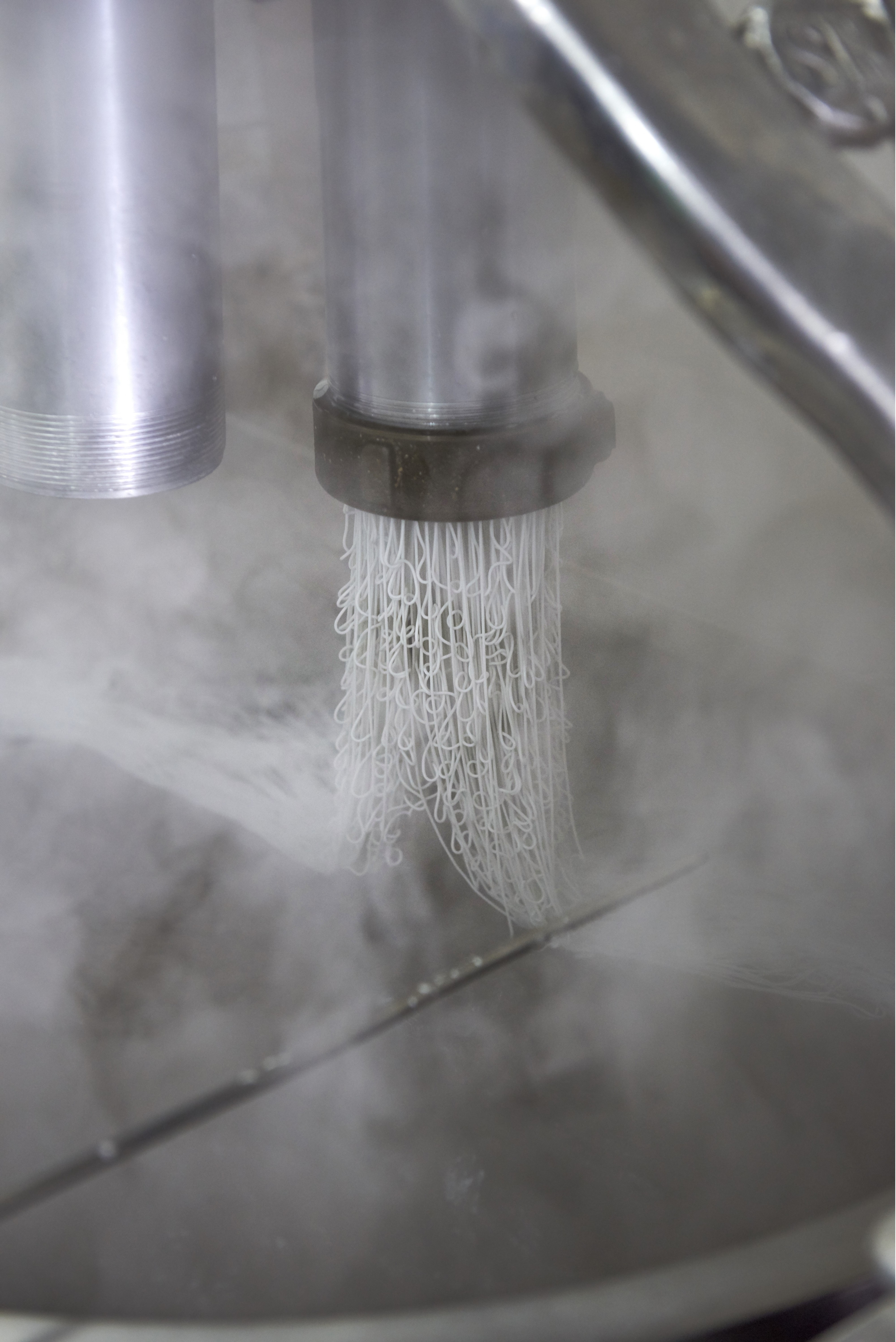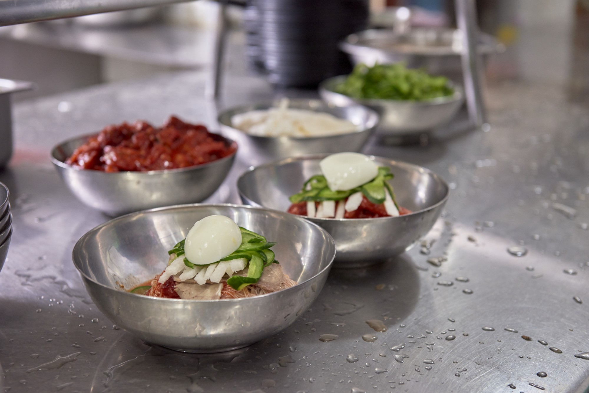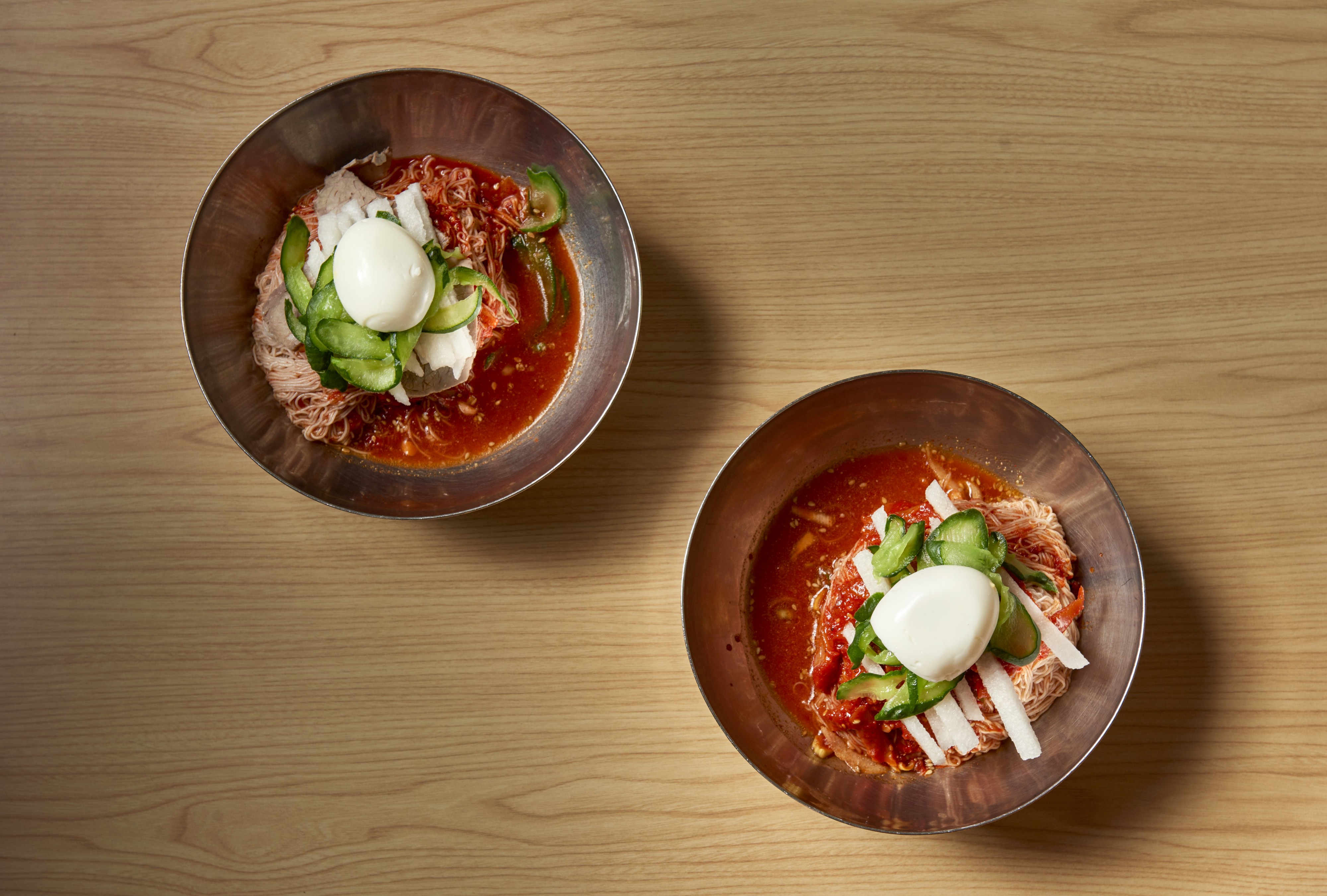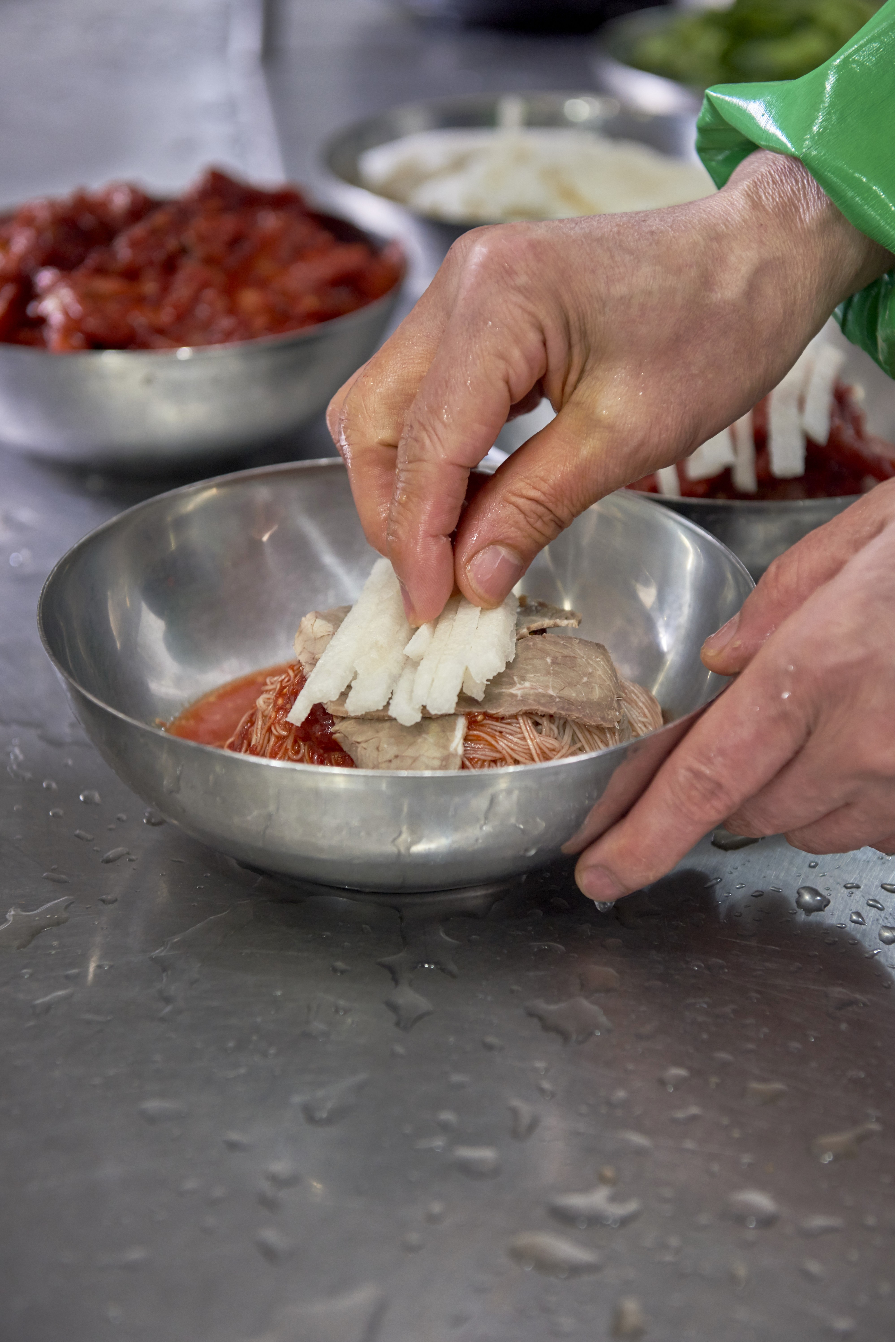 펄펄 끓는 가마솥 위에 있는 기계에 반죽을 넣고 버튼을 누르면 면이 길게 흘러내려 끓는 물로 직행한다. 중요한 건 바로 면을 건져내는 타이밍. 조금만 빨리 건지면 설익고, 조금만 늦게 건지면 퍼져버린다. 건져낸 면은 찬물에서 빠르게 행군 후 얼음물에서 다시 한 번 헹궈낸다. 이어지는 과정은 손맛. 1970년대까지만 해도 함흥냉면은 고구마 전분(감자 전분으로 만들었다는 설도 있다)으로 반죽한 면에 새빨간 양념과 간자미나 홍어회 무침을 올려낸 ‘비빔냉면’을 뜻했다.