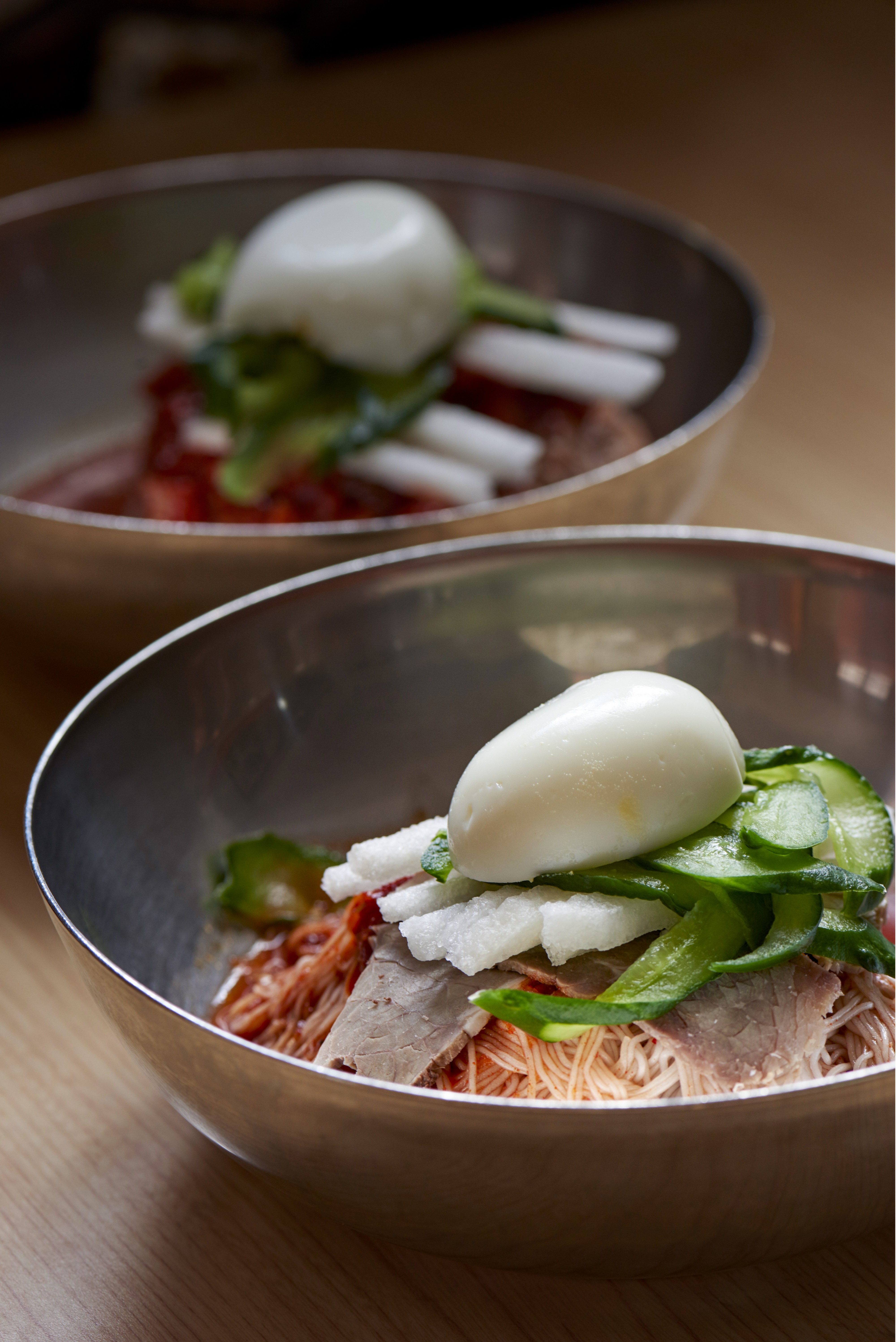 <종로원조함흥냉면>이 맛을 내는 비법은 소고기를 볶은 육수로 만든 ‘맛난이 국물’과 배합한 양념장을 재지 않고 손으로 툭툭 넣는 것. 이 양념에 면을 한 번 버무린 뒤, 취향에 따라 소고기 편육이나 홍어회 무침을 올리고 오이와 배, 달걀 등을 담아낸다. 함흥냉명의 뿌리는 이북이지만 재료는 남한 전역에 걸쳐 깐깐하게 고른다. 오이는 해남에서, 무는 제주에서 들여온다.