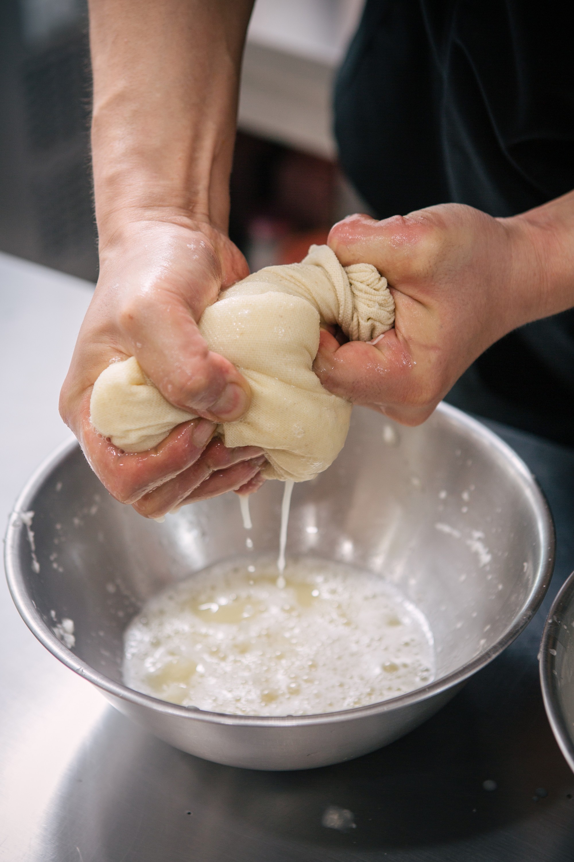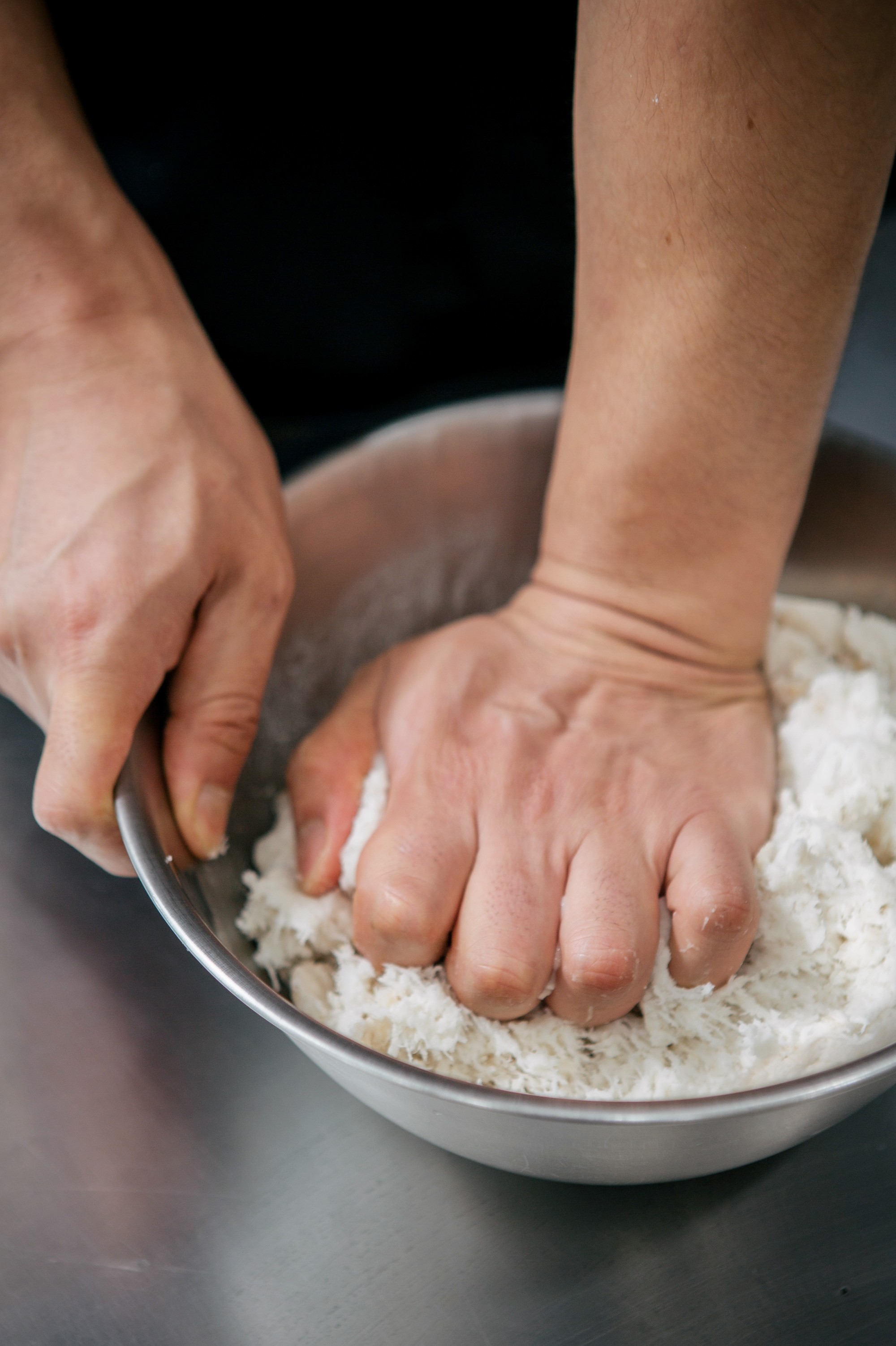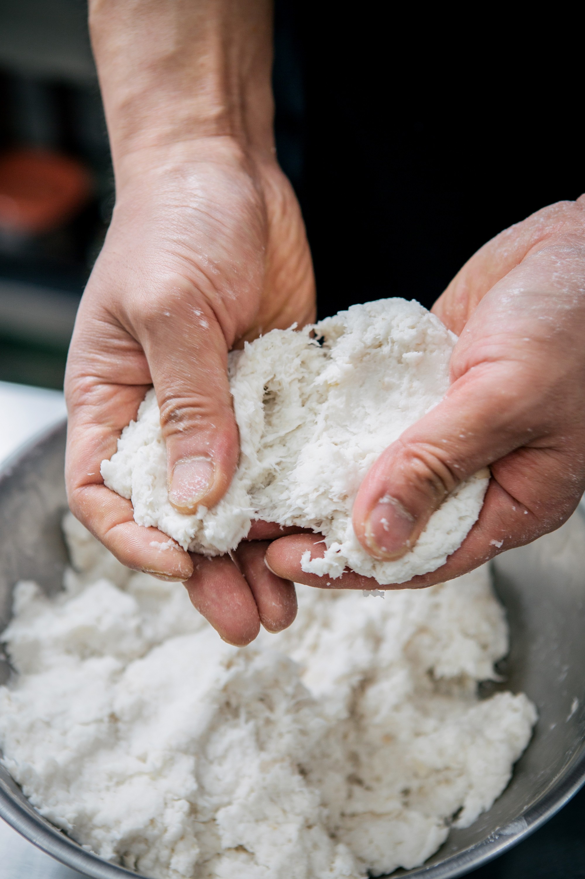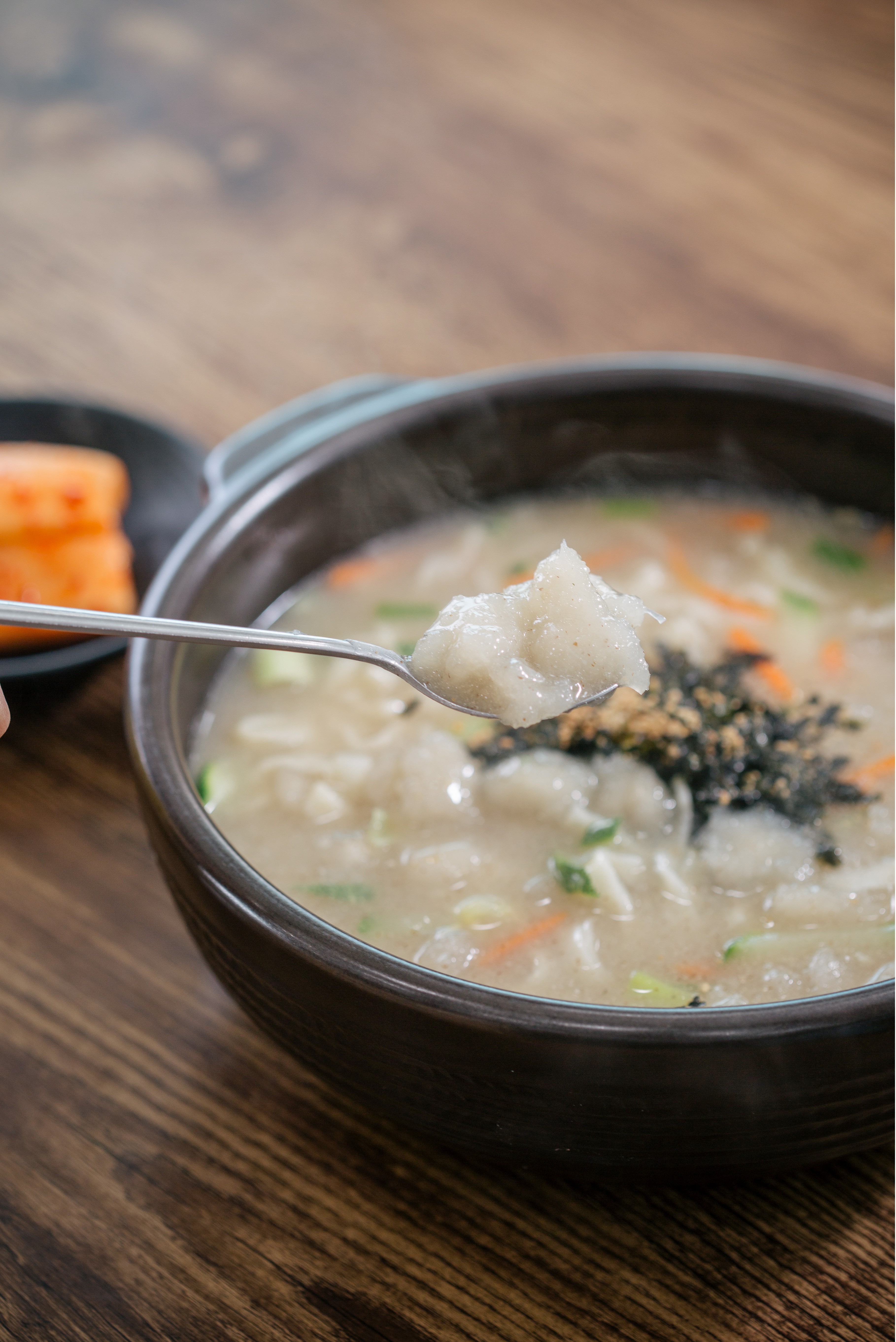 <만선식당>의 옹심이는 쫀득하면서도 거친 감자 결이 생생하다. 조 대표는 “믹서를 이용하면 더 곱고 빠르게 갈 수 있지만 저희는 강판의 원리와 비슷한 기계를 고집하고 있어요. 결이 살아 있어 감자 본연의 맛을 더 잘 느낄 수 있습니다”라고 조심스레 비법을 밝힌다. 반죽에선 감자의 수분을 얼마나 빼는가도 중요하다. <만선식당>은 감자 건지의 수분을 짜는 걸 7-8회 정도 반복하는데, 많이 짤수록 갈변 현상이 적고 아린 맛도 덜하다.