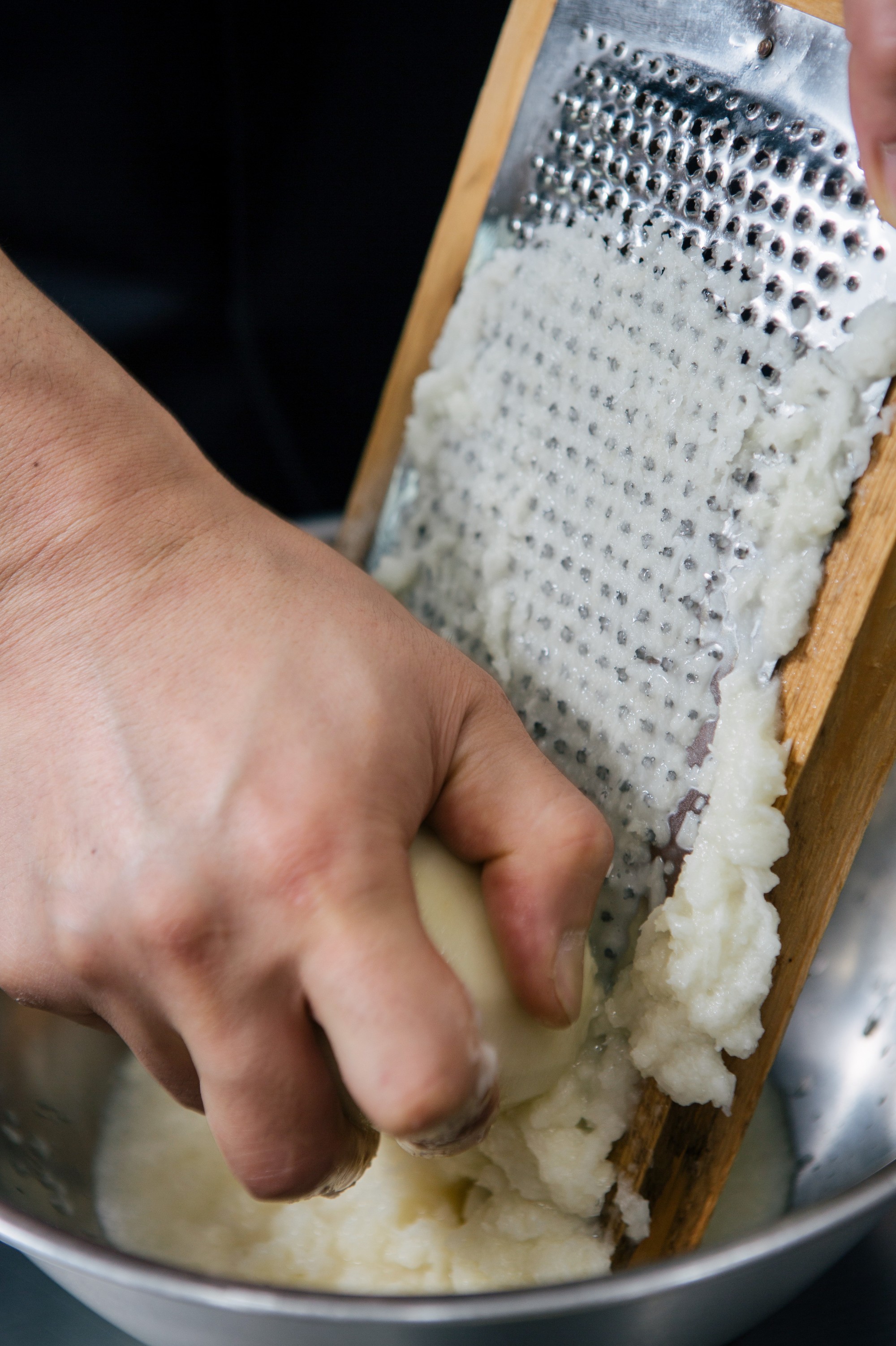 껍질을 벗긴 감자를 강판에 간 후 그 건더기를 보자기에 넣어 꼭 짠다.