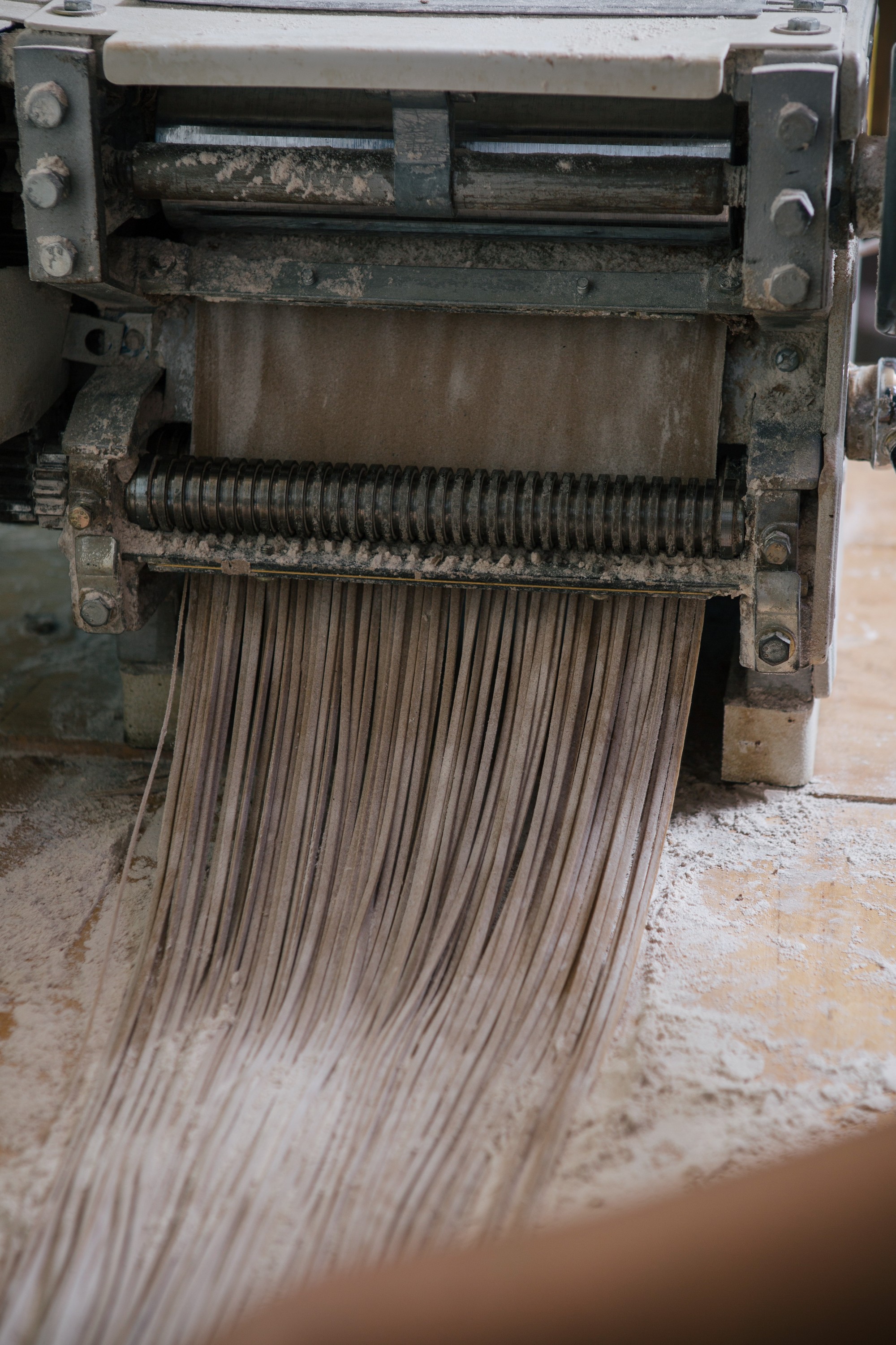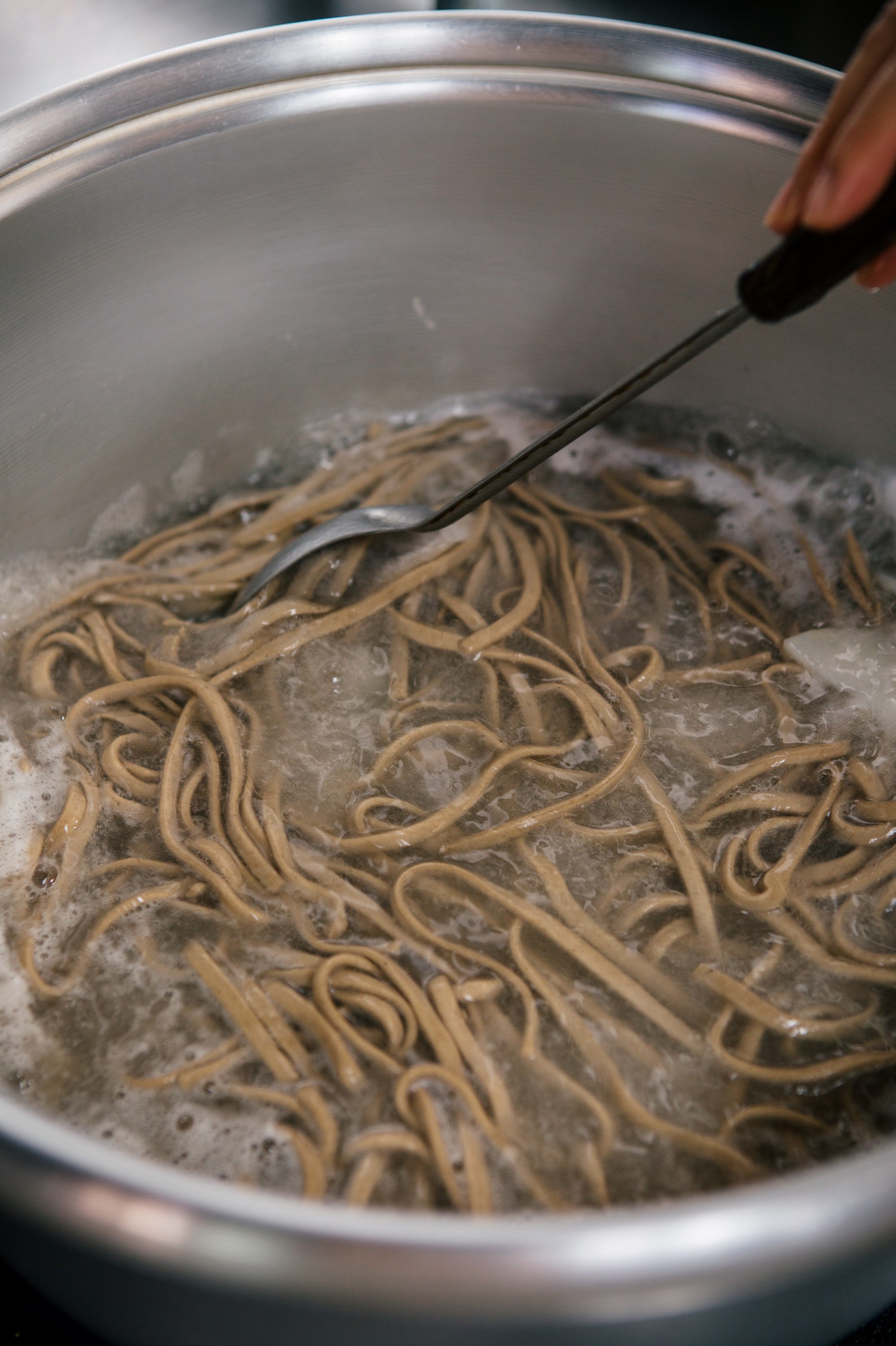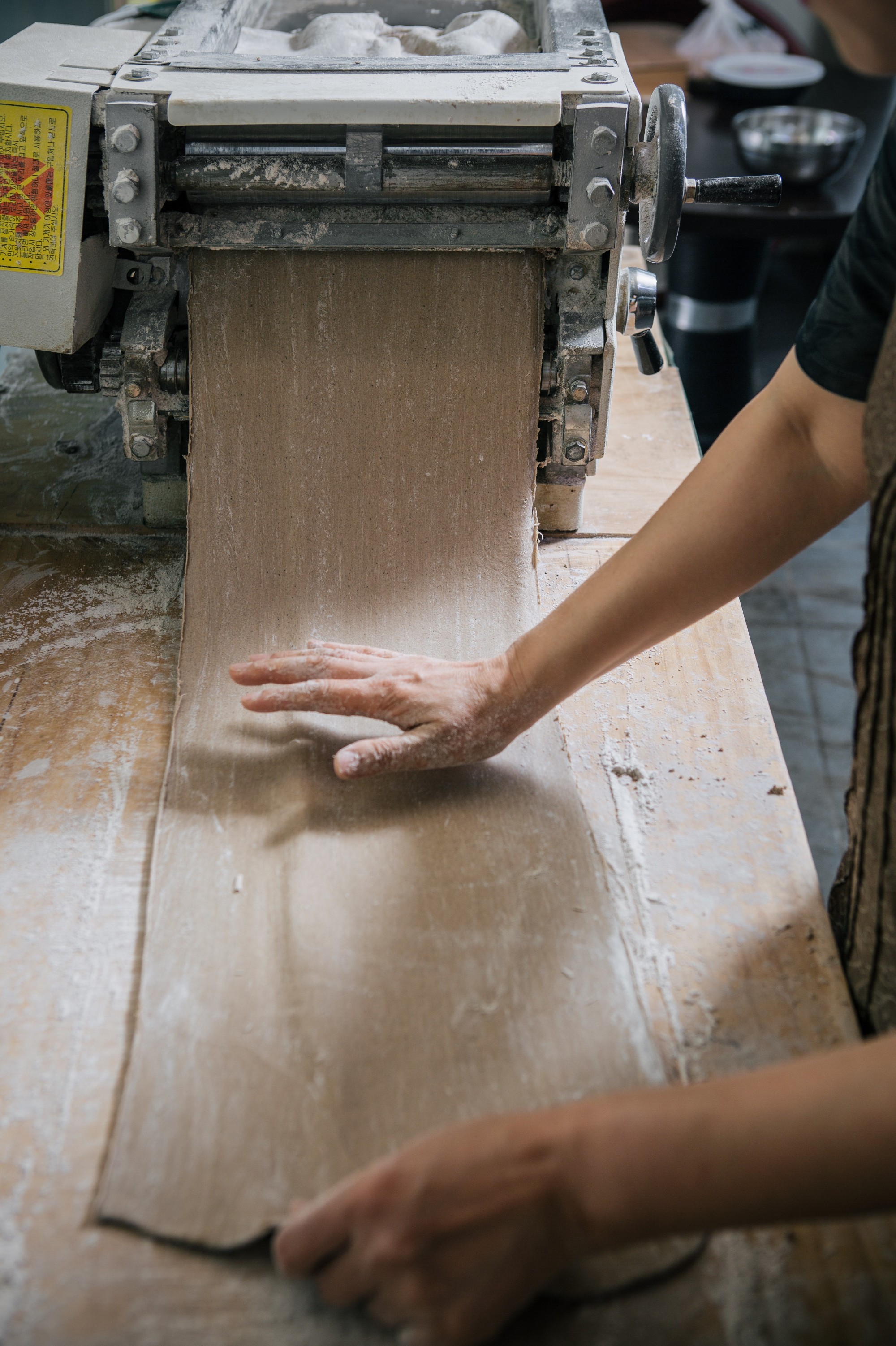 주방 한구석에 마련된 작업 공간에선 매일 아침 그날 사용할 면을 뽑아내는데, 메밀가루에 물을 조금씩 넣어가며 농도를 맞춘다. 이때 약간 질게 반죽해 부드러운 식감을 주는 것이 이상적. 손으로 계속 치대다 한 덩어리가 되면 기계로 반죽을 눌러 얇게 편다. 이 과정을 7-8번 반복하면 반죽에 점점 찰기가 생기는데, 이렇게 완성된 반죽을 다시 기계에 넣어 국수로 뽑는다.