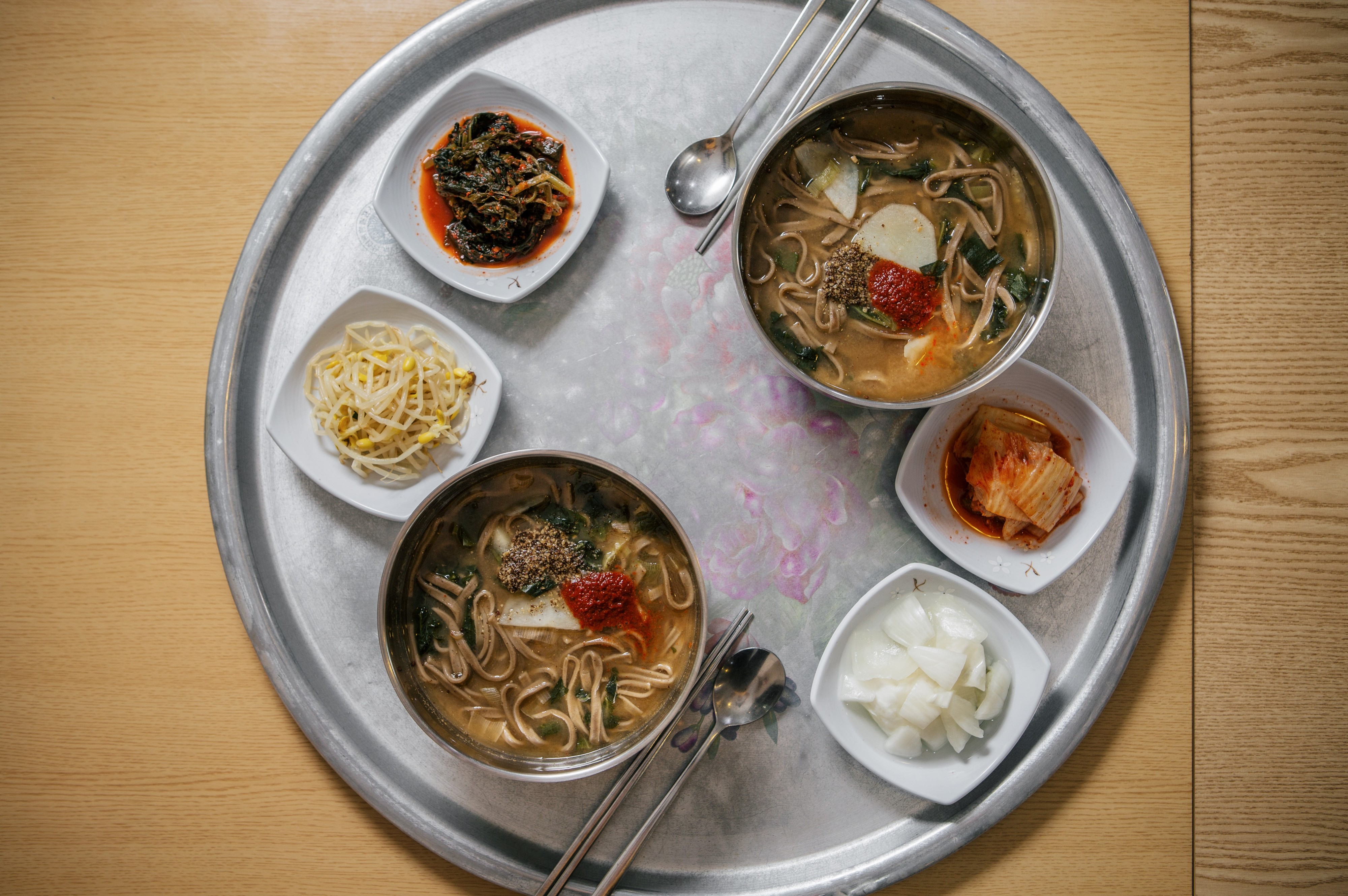 물이 끓어오르면 얇게 썬 감자와 메밀 면을 넣고 익히다 된장을 한 국자 풀어 넣는다. 3-5년 정도 숙성된 집 된장은 구수한 풍미가 일품이다. 배추와 다진 파, 마늘을 넣고 면이 완전히 익을 때까지 10분 정도 더 삶다가, 다 익으면 그릇에 면과 국물을 적당히 담고 매콤함을 더할 양념장과 들깨 가루를 고명으로 얹는다. 물에 된장으로만 육수를 내 심심할 것 같지만 쫄깃한 메밀 면과 배추, 된장 육수의 조합이 예상외로 새롭다. 후루룩 면을 건져 먹고 그릇을 들어 국물을 마시면 시원하게 속이 풀린다.