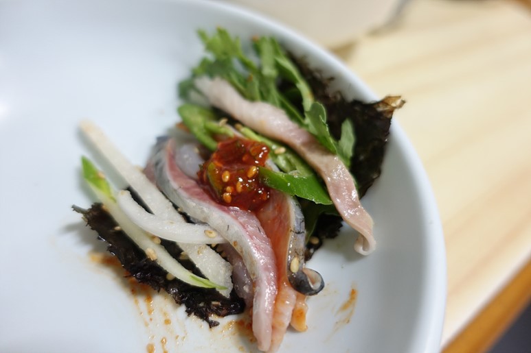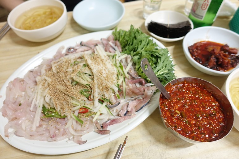 1단계. 접시를 4등분한다. 첫 1/4의 막회는 양념 없이 어금니에 올려 씹는다. 하얀 미주구리는 첫 입에 다소 무미할 수 있지만, 씹을수록 뼈에 붙은 살에서 올라오는 고소한 맛을 느낄 수 있다. 또 중간 중간 등 푸른 생선인 청어가 녹진하게 섞여 있어 황홀한 맛을 낸다.
