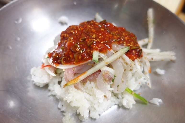 3단계. 취기가 올라올 때즈음, 회를 비벼 먹을 밥을 시킨다. 밥을 시키면 냉면 그릇에 참기름을 뿌린 밥이 덜렁 나온다. 2차로 이 집을 갔을 때, 정말 뱃속에 코딱지만큼도 공간이 없을 정도로 배가 터질 듯 불렀는데 이게 또 막 들어간다. 마지막으로 4단계. 앞서 이야기한 3가지 방법 중 가장 맛있었던 방법으로 먹고 또 먹는다.
