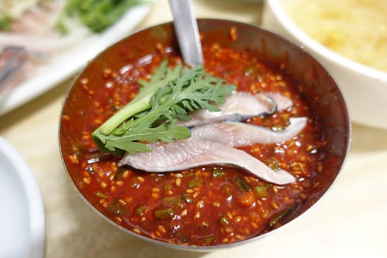 2단계. 날 생선의 섬세한 맛이 지루할 때쯤 양념장을 조금 떠서 먹을 만큼만 막회에 비벼 호방한 맛으로 먹는다. 한 번만 맛본 사람은 없다는 뇌쇄적인 맛의 영덕회식당. 미식가 사이에서도 최고 중 하나로 꼽히는 이유는 바로 이 마성의 양념장 때문이다. 일단 반짝이는 빨간 빛깔이 눈길을 사로잡는다. 또 양념장을 회와 섞으면 생선의 섬세한 맛은 사라지지만, 강렬한 양념장은 소주와 최고의 마리아주를 이룬다. 이땐 갑작스레 기분이 좋아져 날김에 막회를 싸 옆 사람 입에 마구 넣어주게 될 정도.