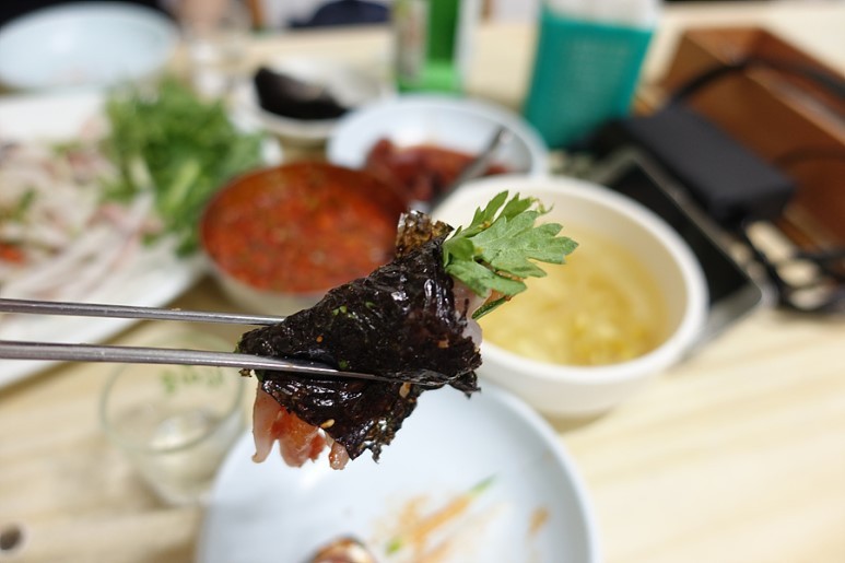 잔뼈 굵은 이모들의 접객은 투박하다. ‘회’라는 장르와 어울리지 않게 위생도 그다지 좋아 보이진 않는다. 하지만 사람들이 이 오래된 식당에 모여드는 이유는 여기에 ‘산해진미’가 있어서가 아니다. 각박하게 돌아가는 세상, 경쟁에 뒤쳐지지 않으려면 죽을 힘을 다해 뛰어야 하는 세상, 그런 세상에서 잠시 벗어나 시간이 정지한 듯한 이 노포 한 구석에 잠시 머무르는 것. 그리고 사람들과 어깨를 부딪치며 소주 잔을 따르다 보면 나도 모르는 사이 시름이 좀 덜어진다. 물자가 풍족한 시대 막회는 앞으로 사라져갈 장르인 것도 같지만, 이 노포의 허름한 간판과 양념장을 떠올리면 막회가 사라질 날은 다음 세기에나 올 일 같다.