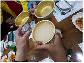 막걸리를 흔들지 않고 먹는 사람은 처음 보네요. 짠!!!♡